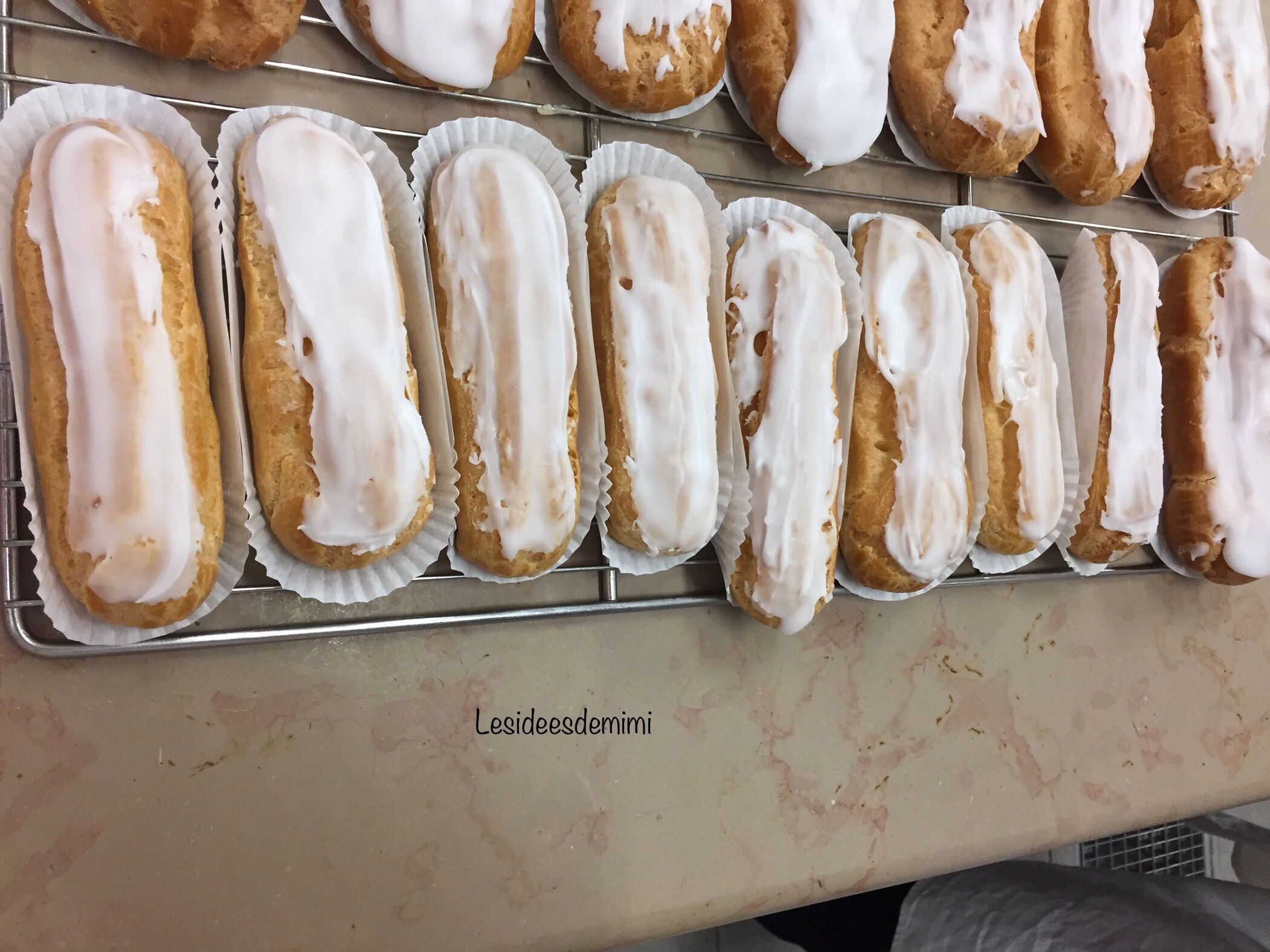 Comme tu le vois je ne suis pas du tout à l’aise avec la technique de glaçage n°1 cf photo éclairs à la vanille. J’y arrive mieux avec la technique de la spatule cf photo éclairs au chocolat, même s’il va falloir que je m’entraîne, car le geste n’est pas encore maîtrisé!