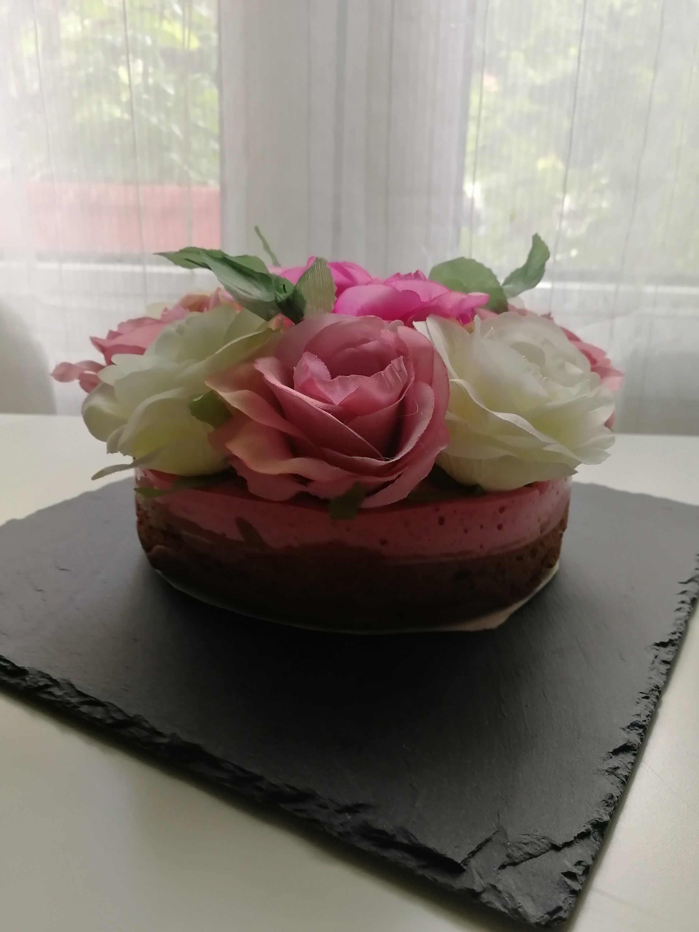 J’ai réalisé cet entremet pour la fête des pères. Le mien adore les mousses et voulait un entremet mousse sans croquant ni biscuit. Je suis donc partie sur une base de biscuit cuillère au cacao qui permet d’obtenir un fond pour tenir l’entremet tout en gardant un aspect moelleux et nécessitant très peu de mâche. Dessus il y a une couche de mousse au chocolat très fondante et une mousse à la framboise apportant un petit peps.