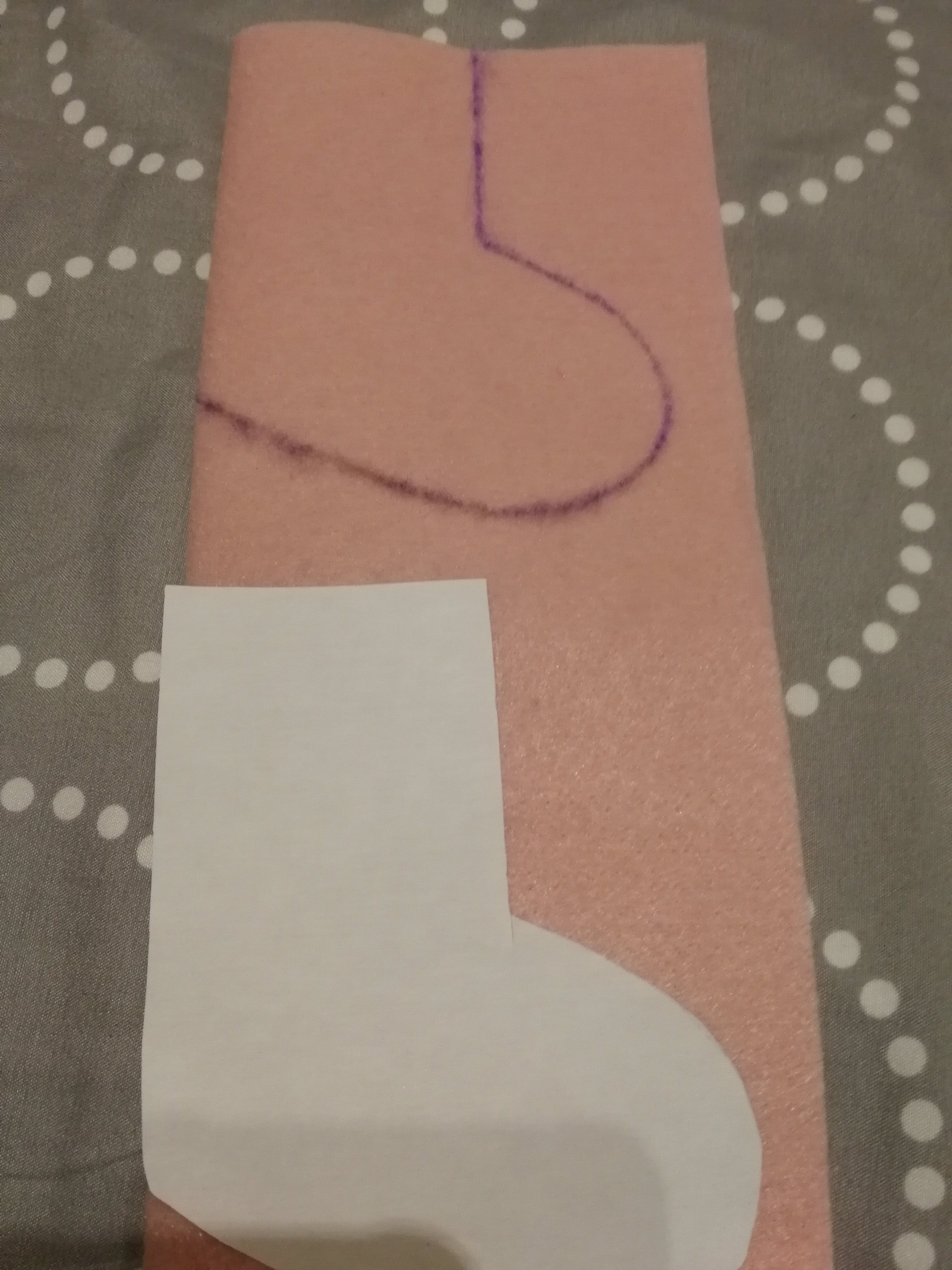 - Plie en deux un morceau de feutre (ou tissus) et reporte le modèle de chaussette que tu as dessiné.