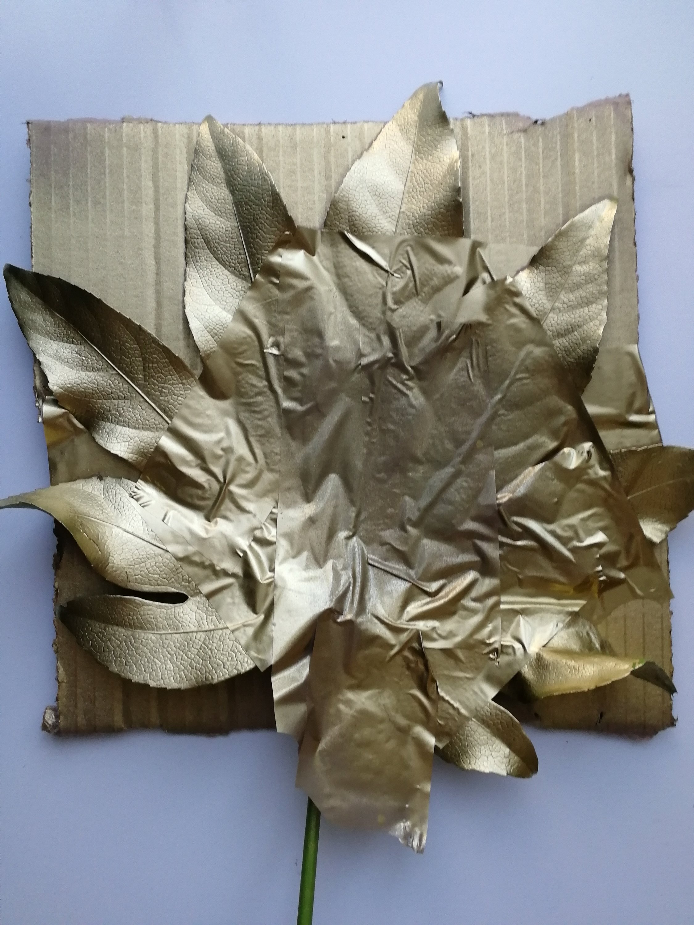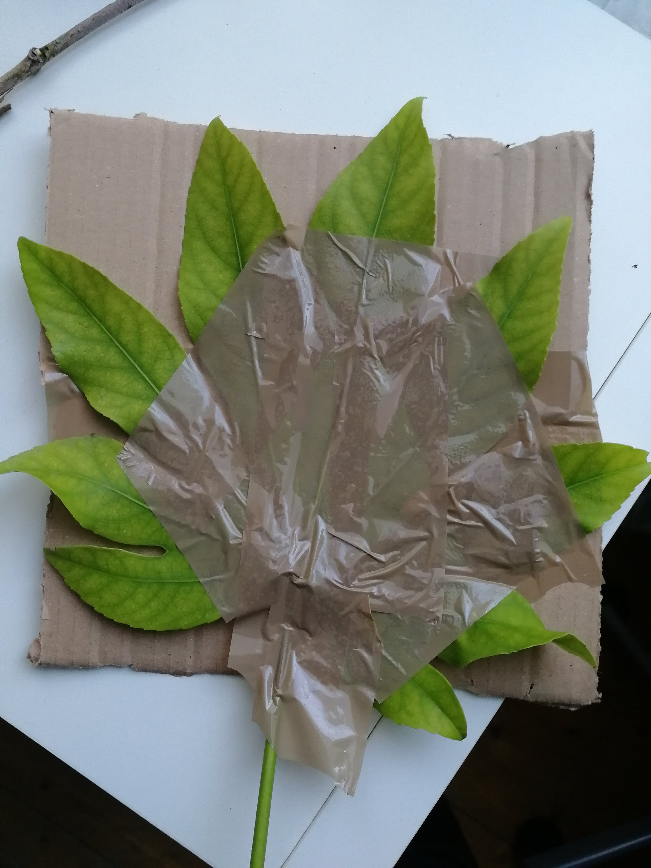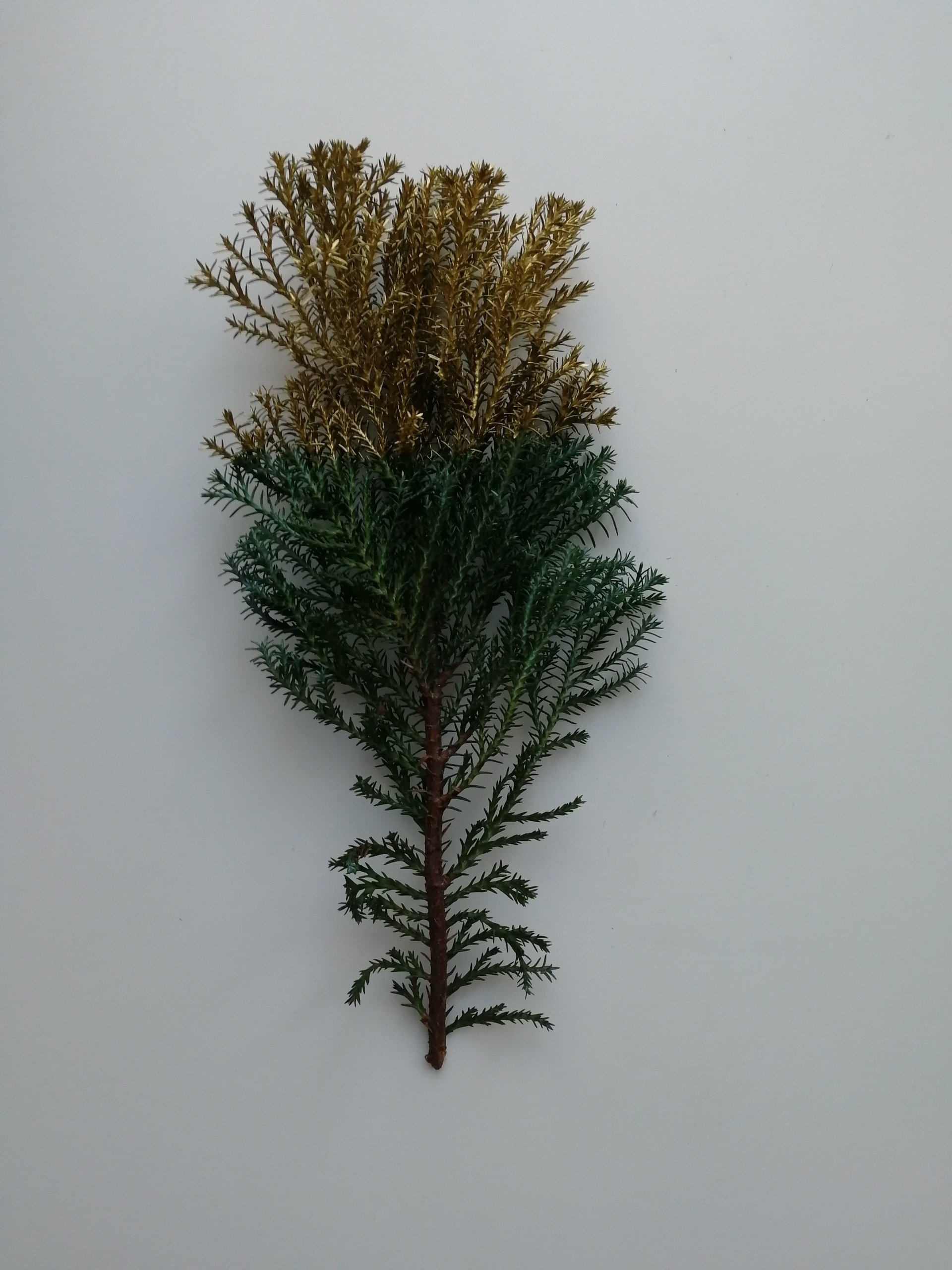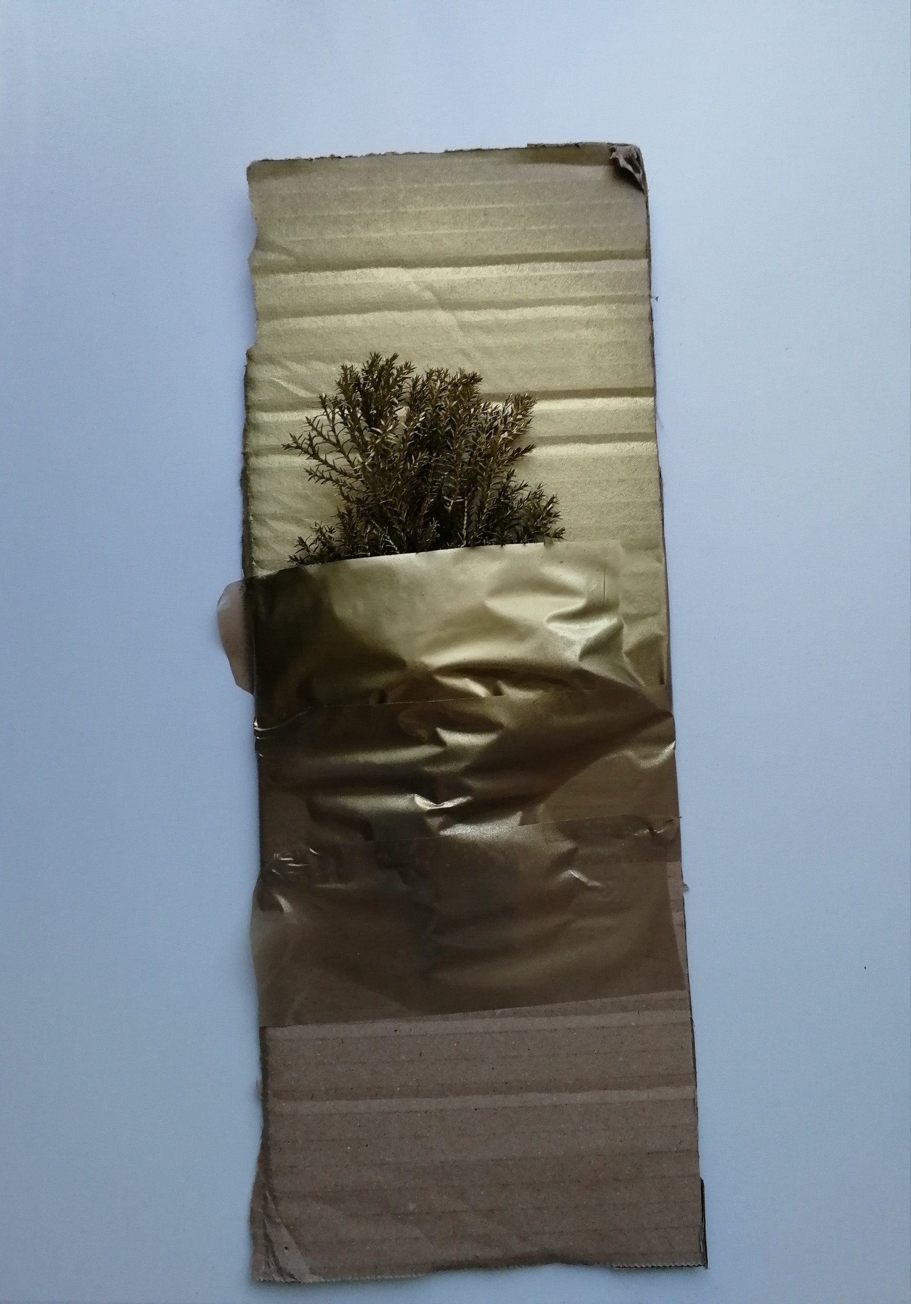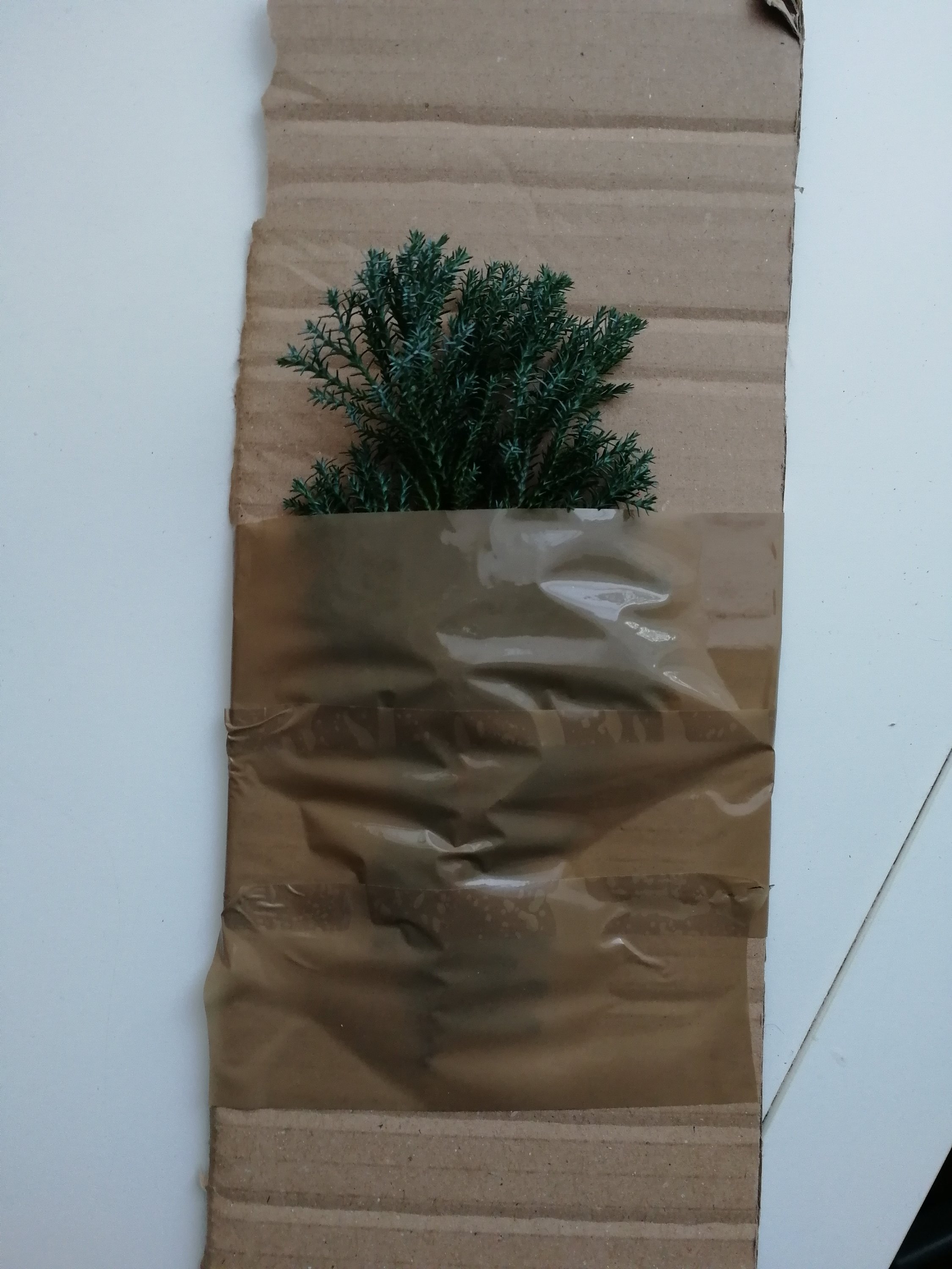 - Scotch la branche de sapin sur un morceau de carton, en veillant à protéger la partie que tu ne souhaites pas peindre.