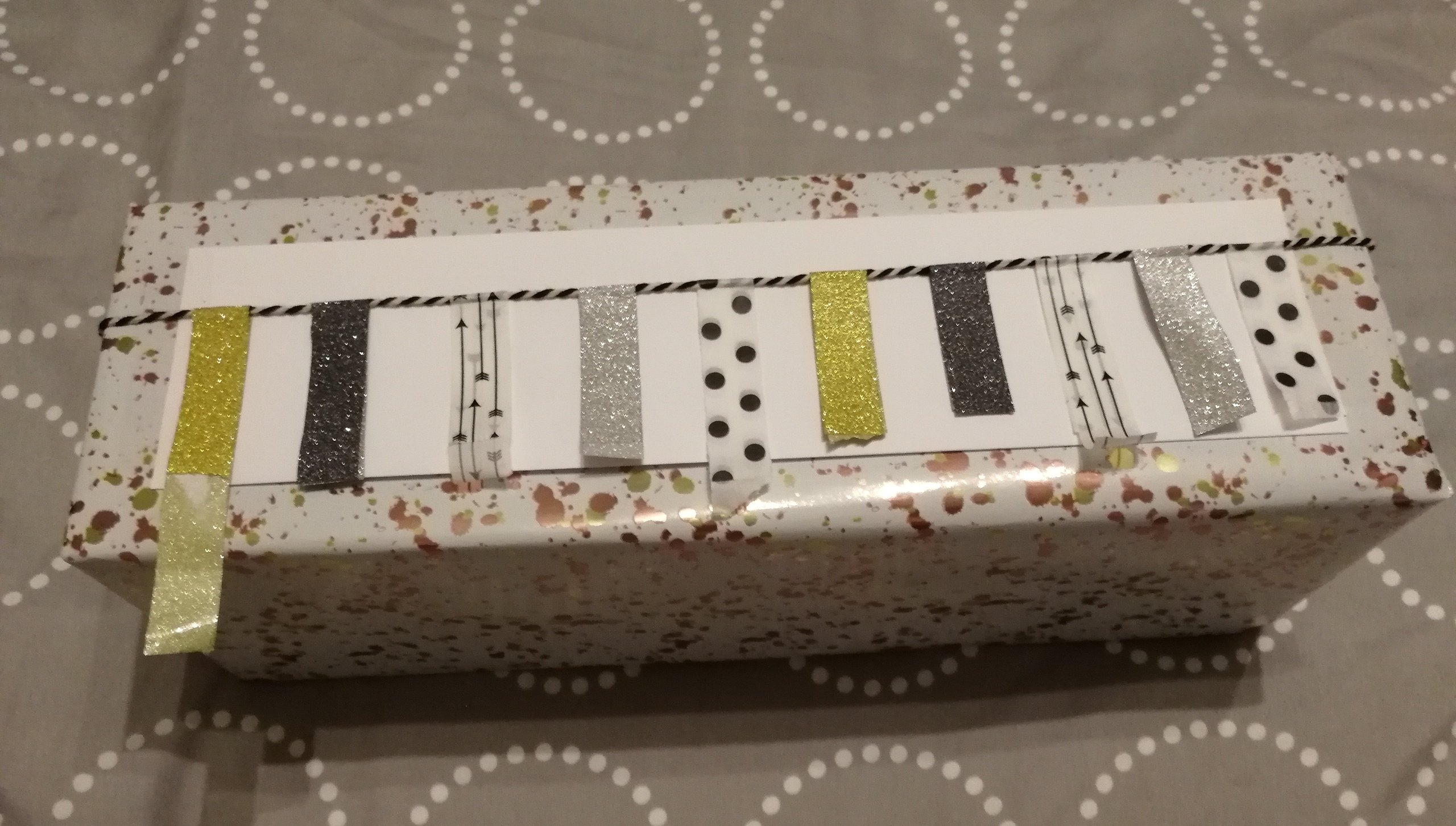 - Enroule et scotch deux morceaux de ficelles autour de ton cadeau. (A hauteur différente).