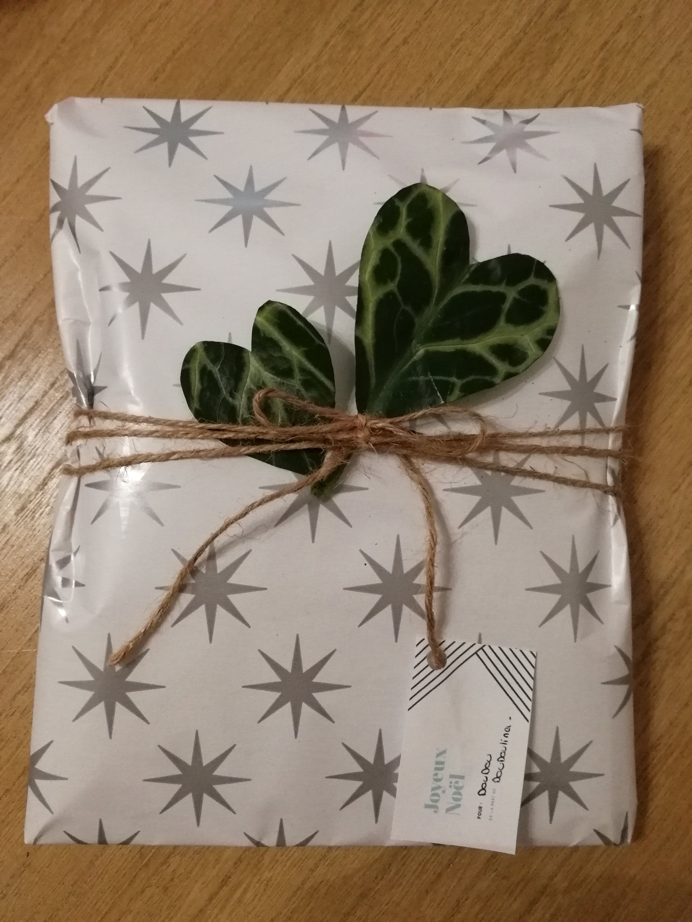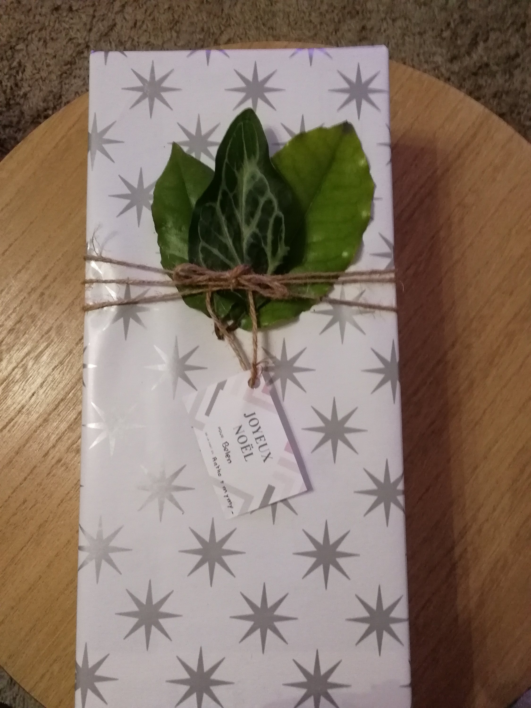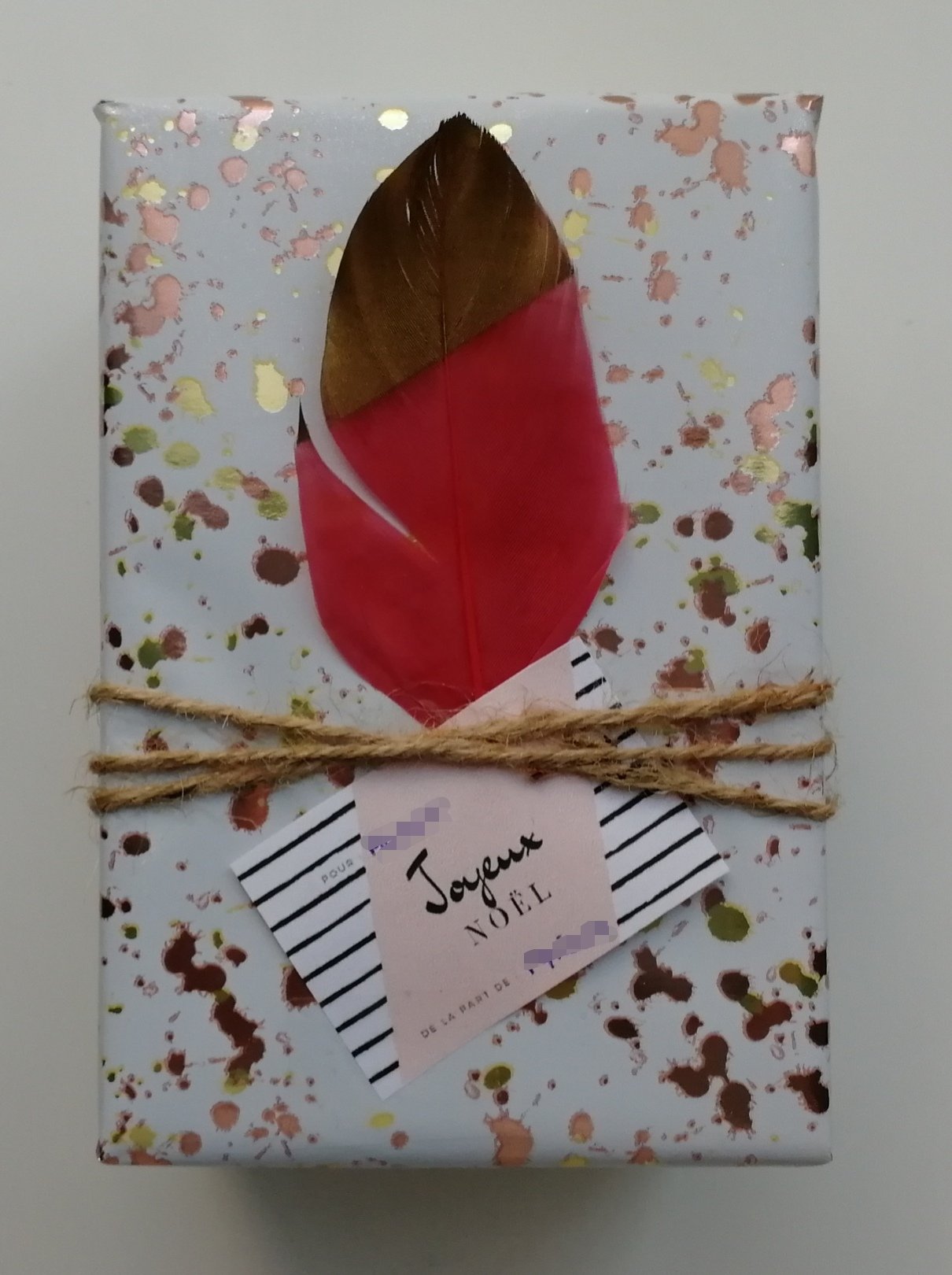 Je suis dans ma période emballage personnalisé avec une touche de nature et verdure. Cette année j’ai donc choisi un papier cadeau un peu neutre, mais sympa quand même et j’ai agrémenté chaque cadeau de ficelle, feuille, plume, etc.