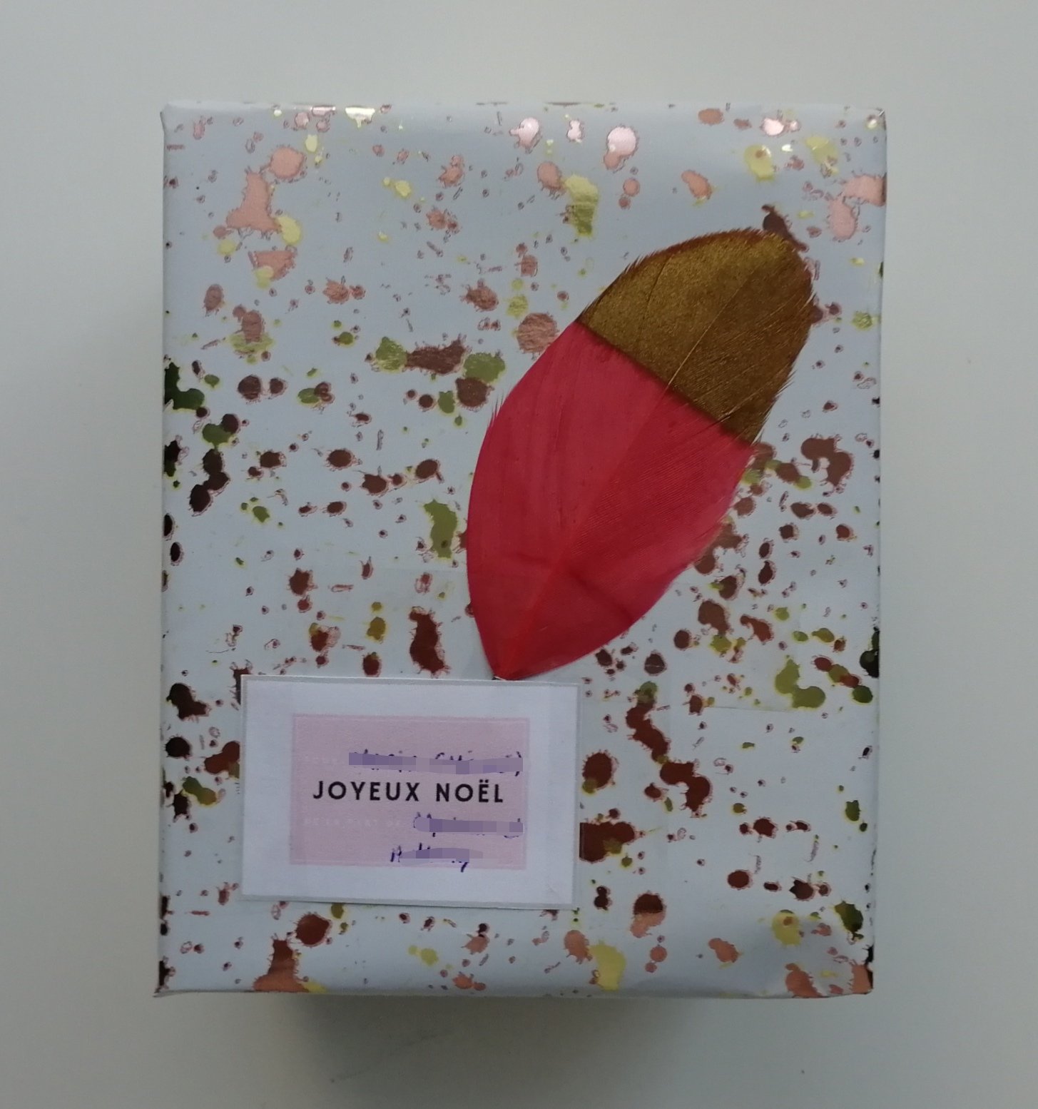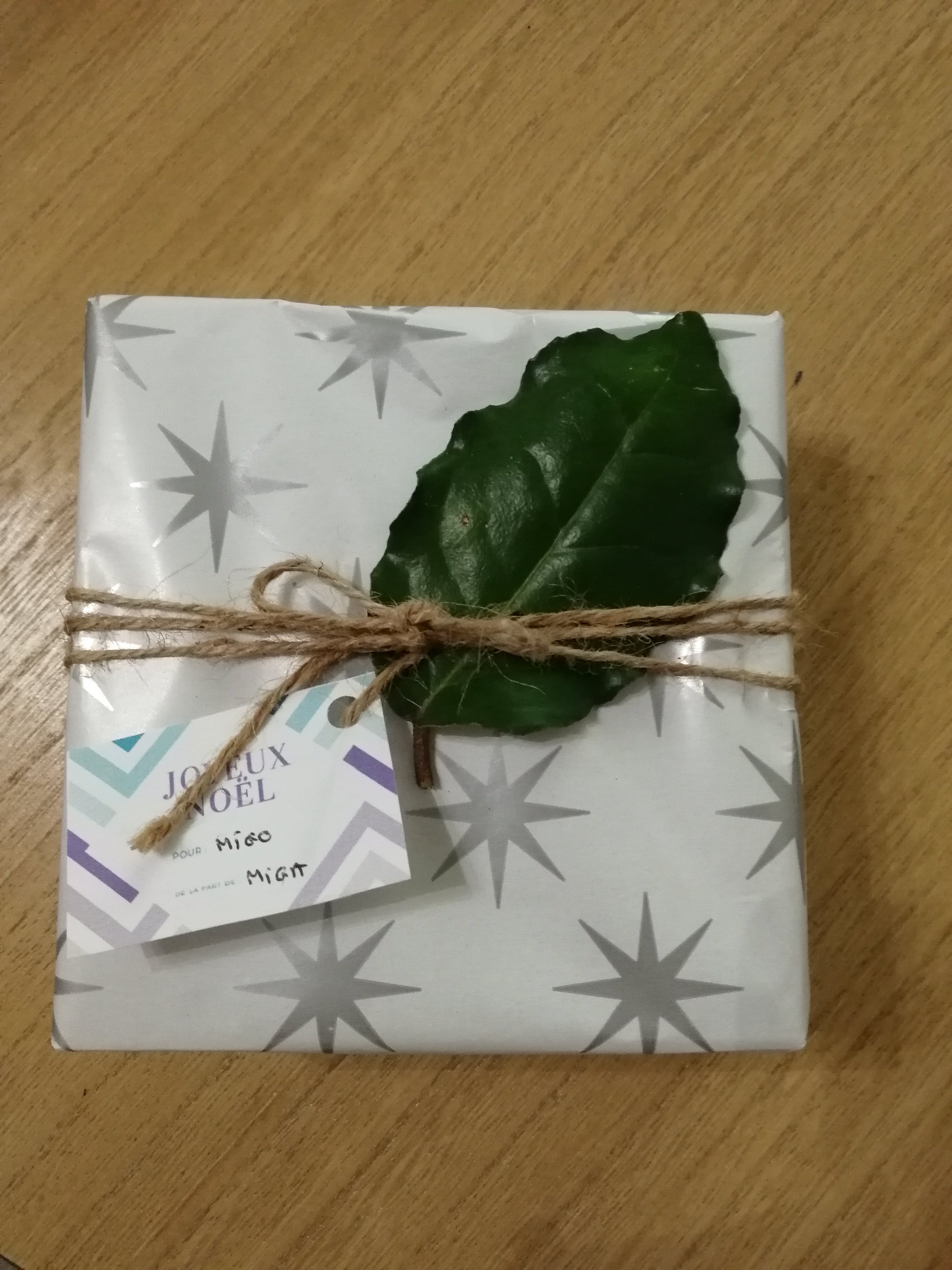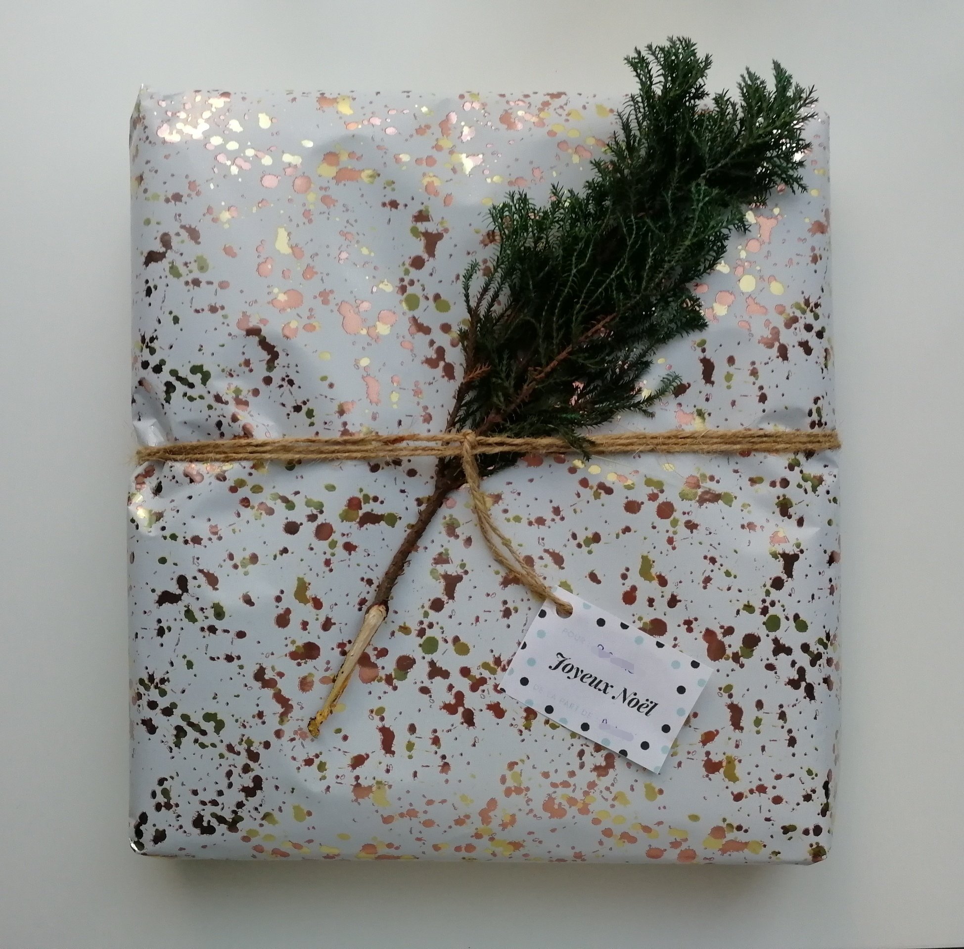 Je suis dans ma période emballage personnalisé avec une touche de nature et verdure. Cette année j’ai donc choisi un papier cadeau un peu neutre, mais sympa quand même et j’ai agrémenté chaque cadeau de ficelle, feuille, plume, etc.