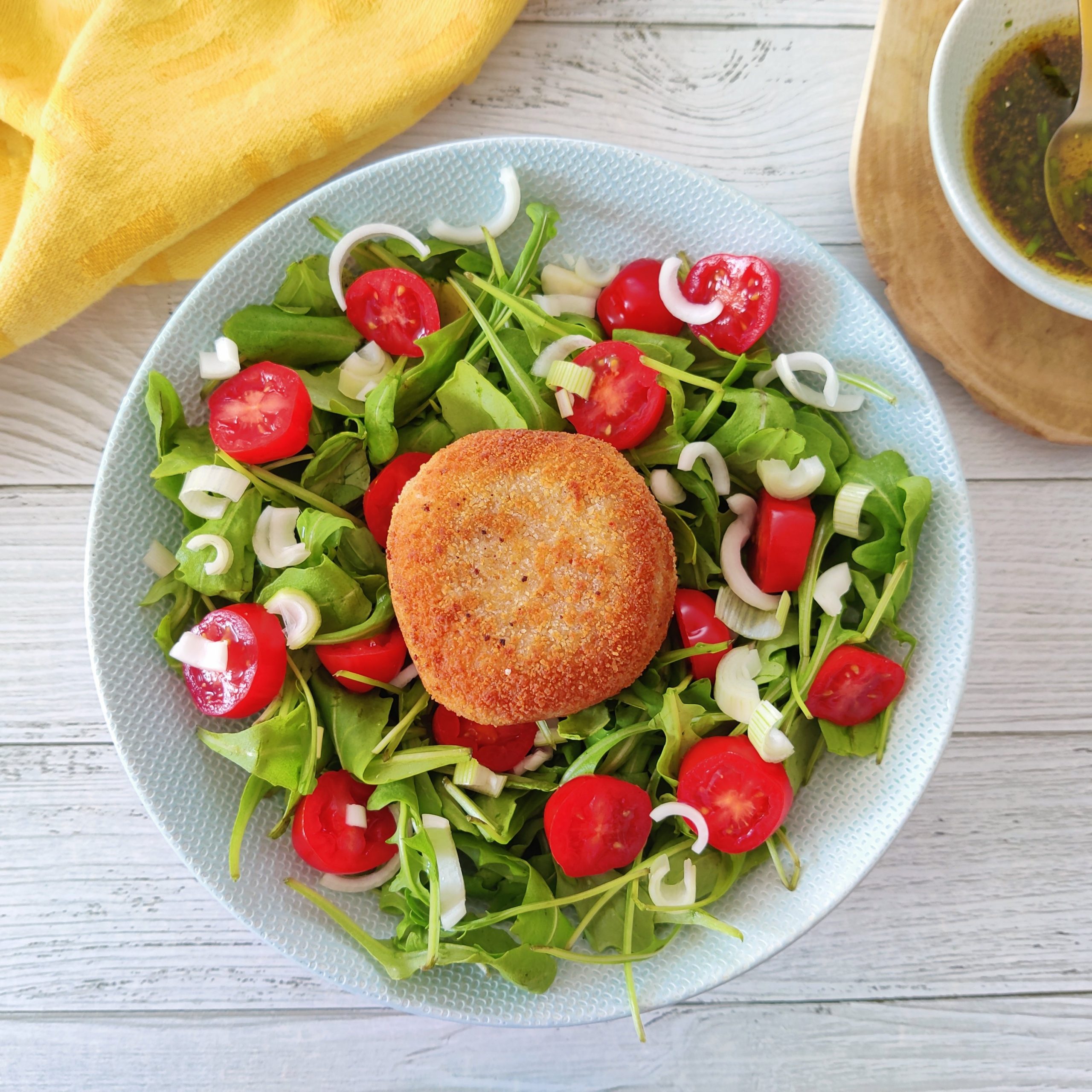 - Prépare une salade de crudités en mélangeant la salade, des morceaux de tomate cerise et l’oignon nouveau.