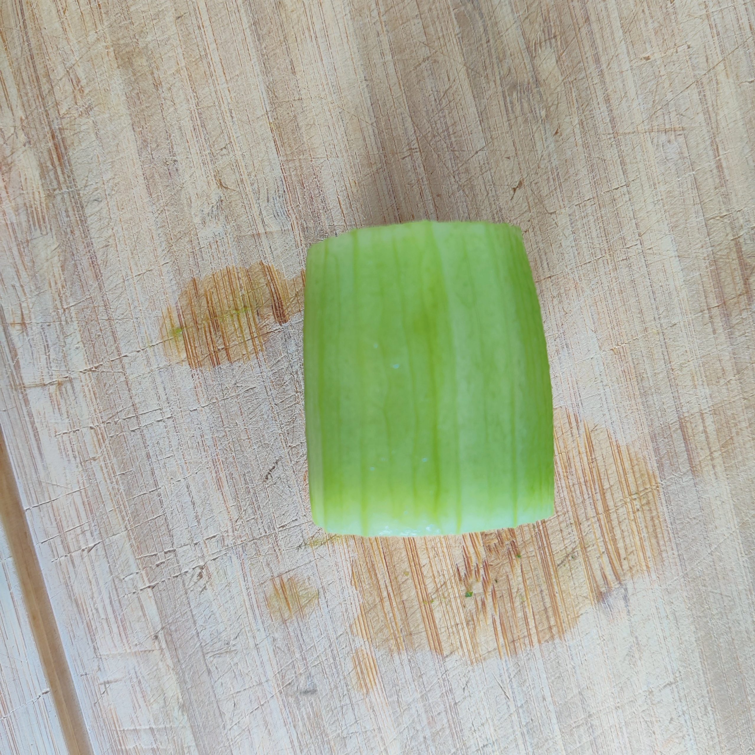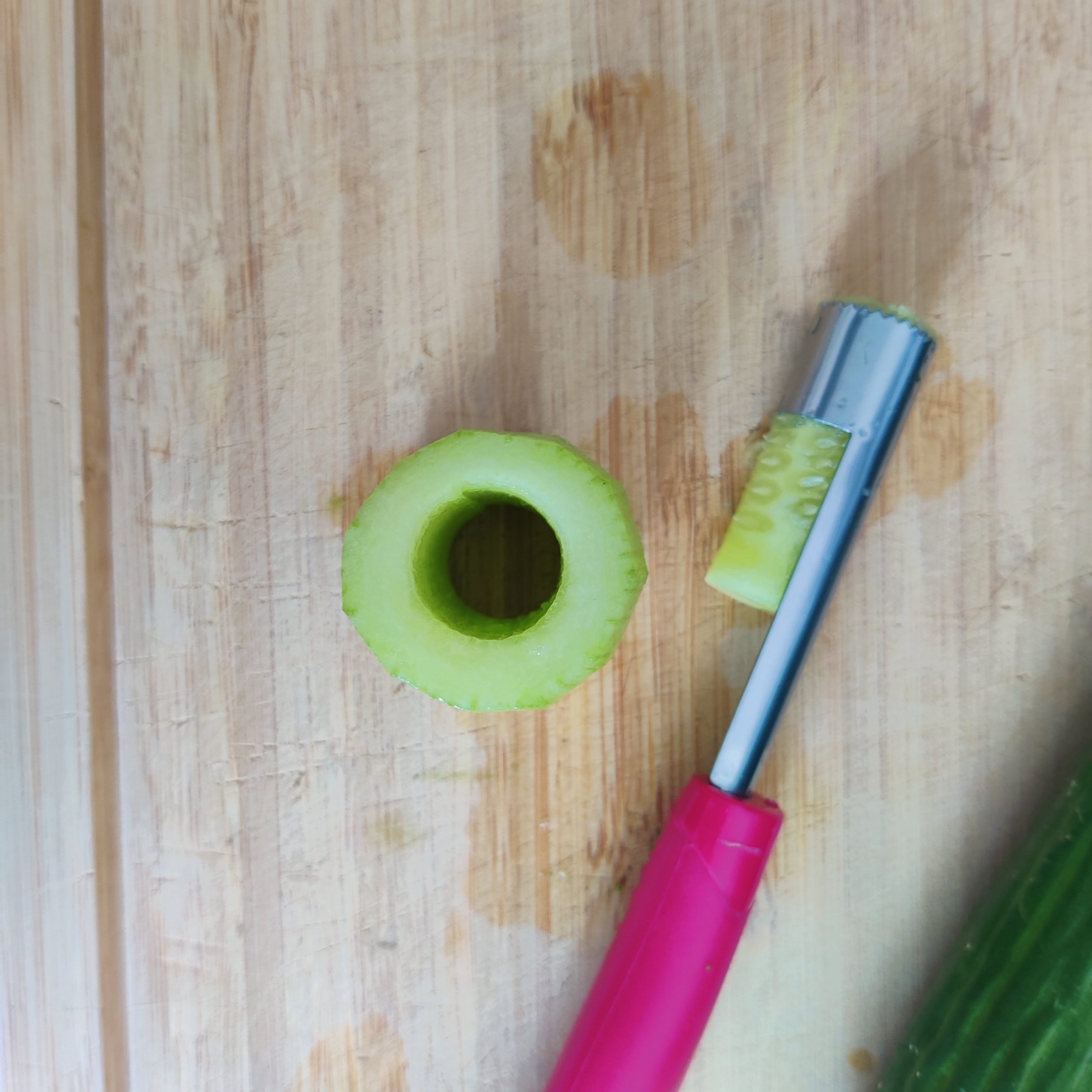 - Épluche le concombre, puis coupe-le en tronçons. (ce sera plus simple pour retirer le cœur)