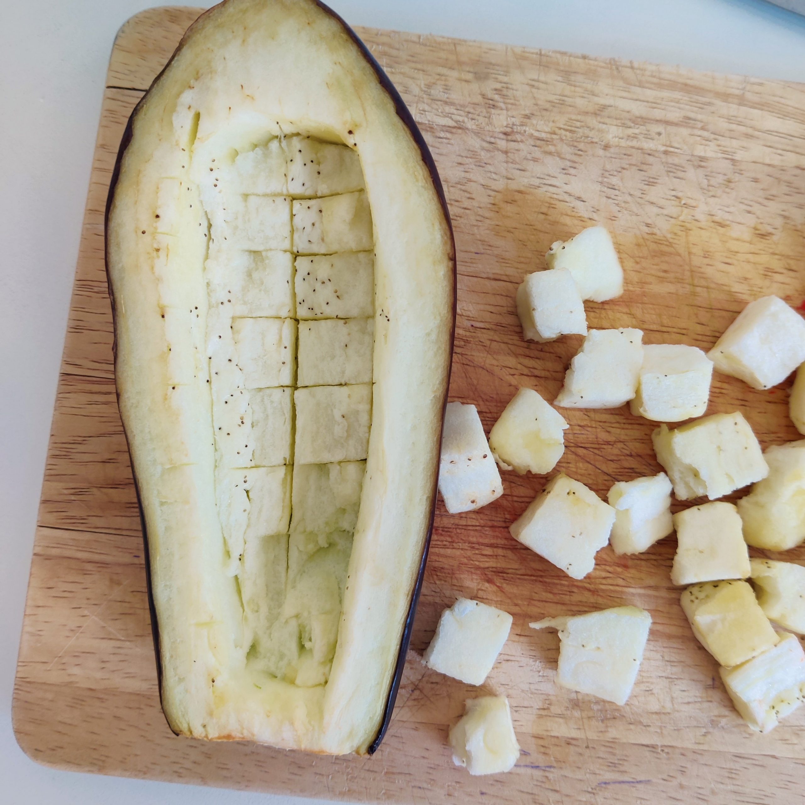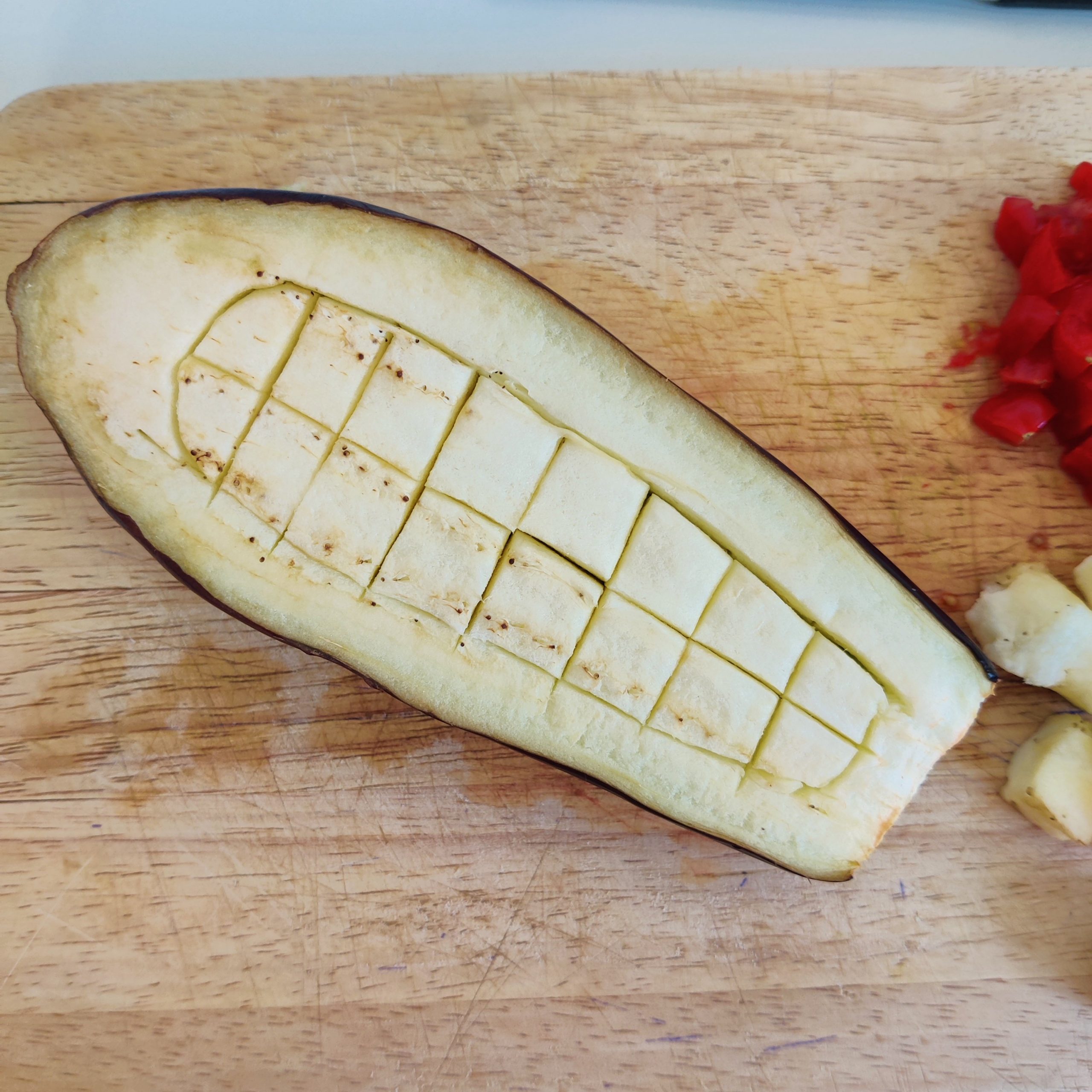 – Coupe l’aubergine en deux, puis à l’aide d’un couteau, trace un quadrillage au centre sans transpercer l’aubergine.