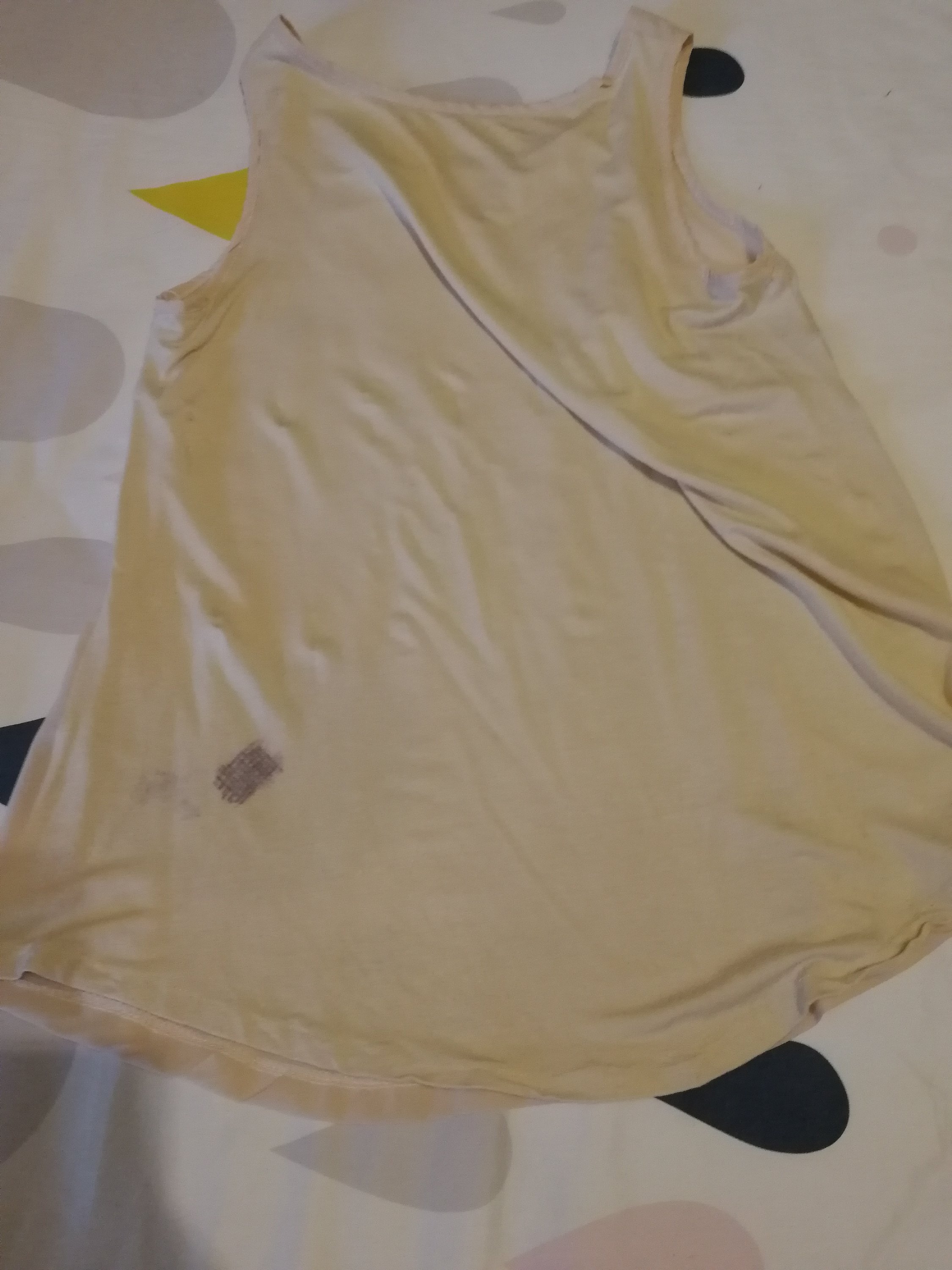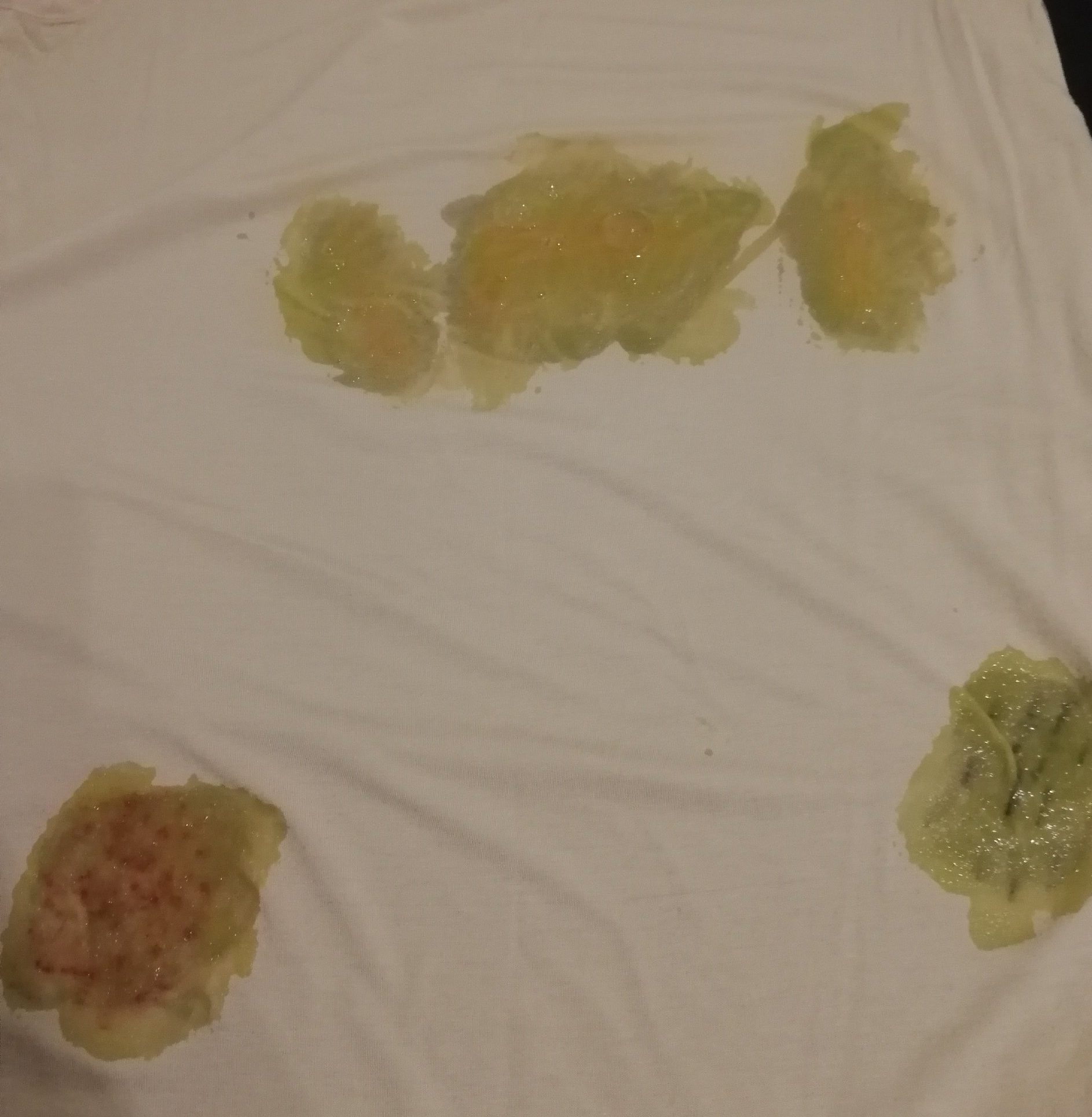 J’étais tellement étonnée du résultat, que j’ai voulu tester cette astuce sur d’autres taches, ainsi j’ai à nouveau taché mon haut, avec cette fois-ci :