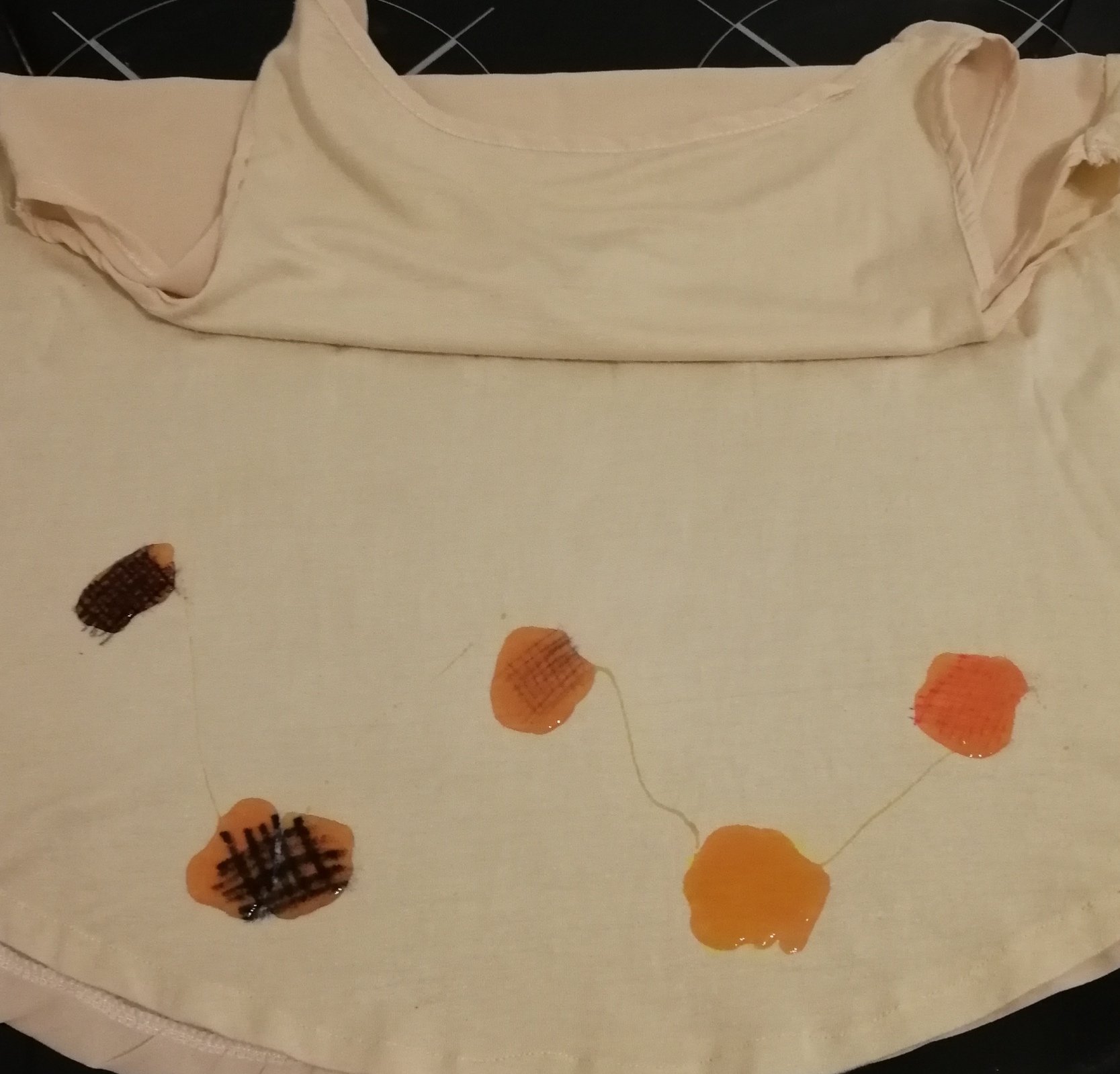 Malgré la tache de stylo feutre qui n’est pas partie, j’ai voulu tester une dernière fois avec d’autres taches, ainsi pour ce dernier teste j’ai taché mon haut avec :