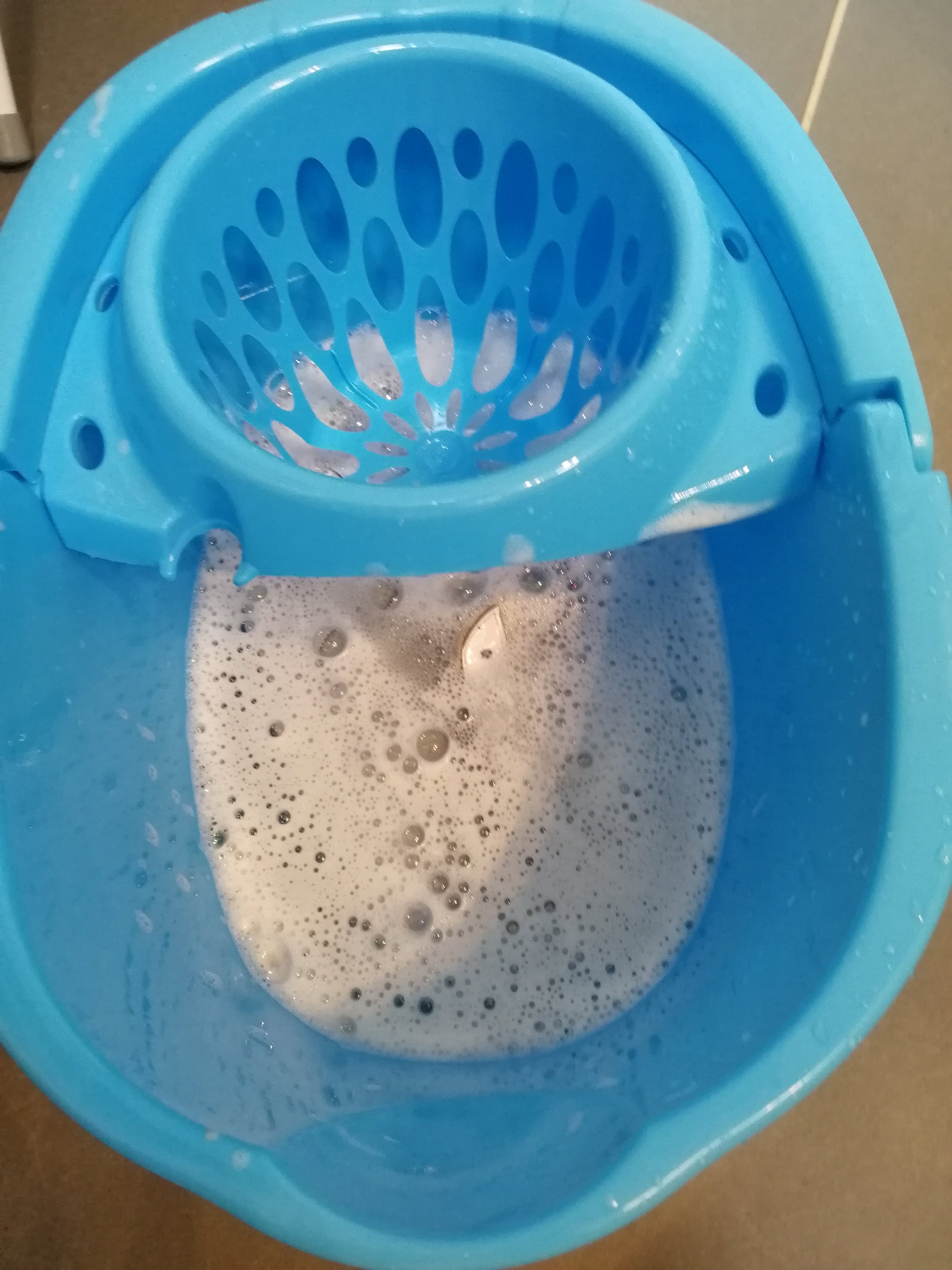 - Ensuite, je les ai laissée tremper dans un sceau avec un peu de lessive et un peu de javel (vraiment très peu), pendant 1h.