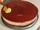 - Verse délicatement le coulis sur le bavarois. (Pour le coup, fait attention à ne pas tout verser d’un coup pour ne pas creuser la crème, vas-y doucement, mais en le coulant toujours au centre, puis fait comme pour la crème, secoue un peu le moule pour que le coulis s’étale uniformément).