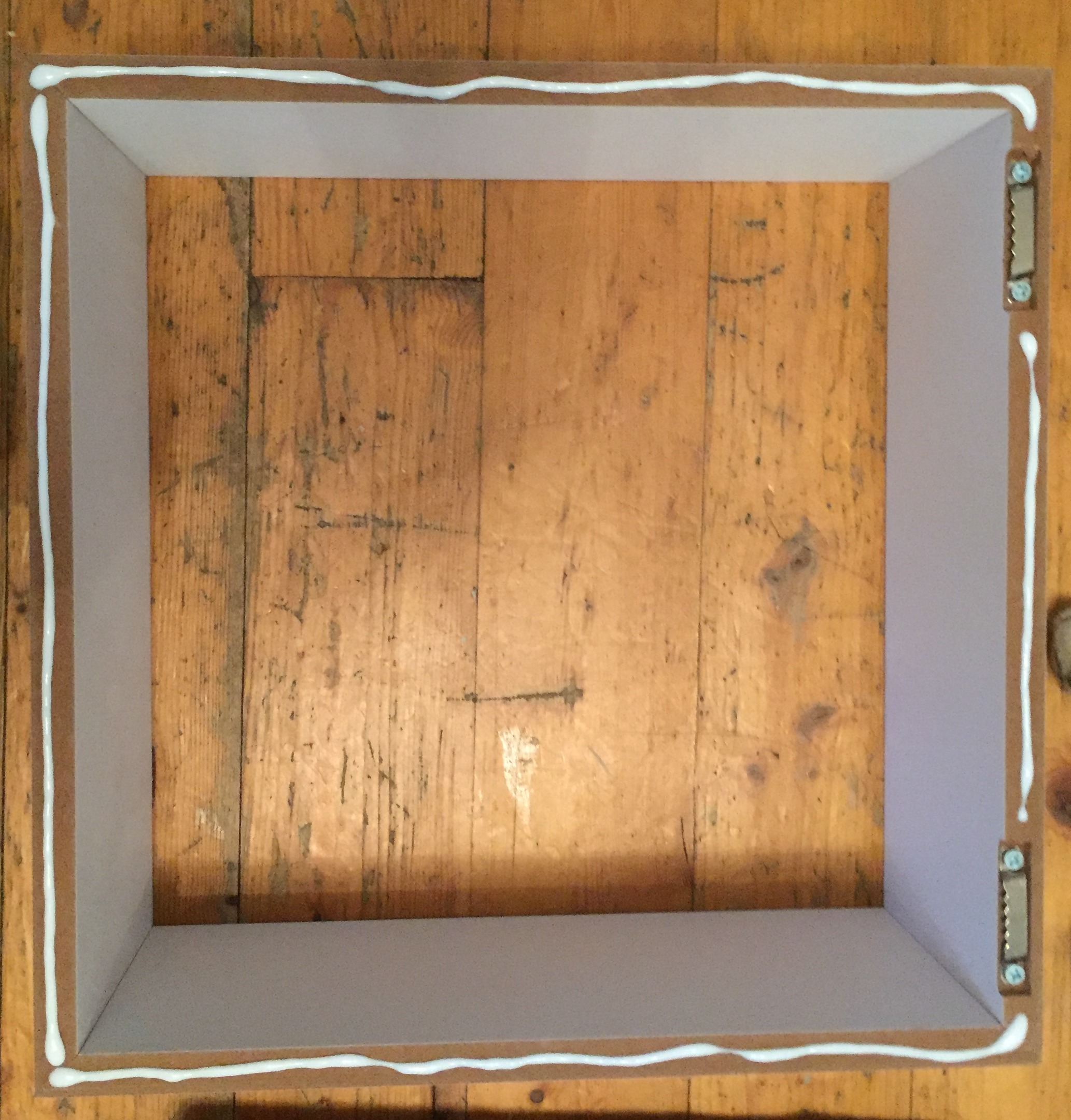- Encolle avec de la colle blanche l’arrière du cube, puis positionne le carton dessus.