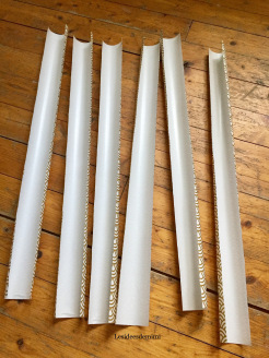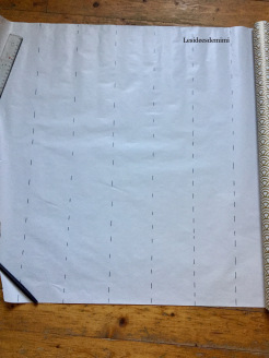 - Trace des bandes de 10 cm de large sur ton papier (j’ai utilisé du papier cadeau, pratique par sa longueur)