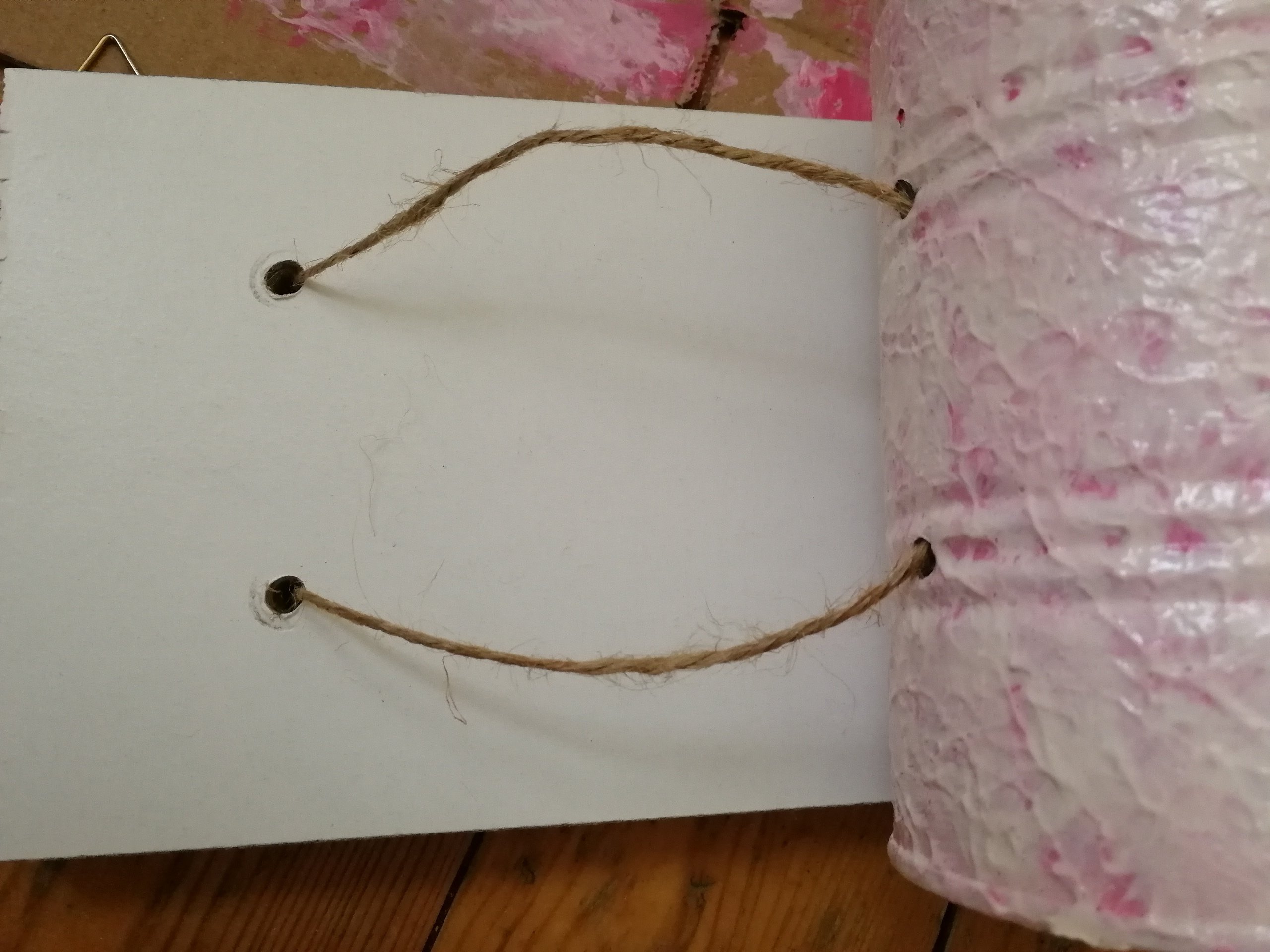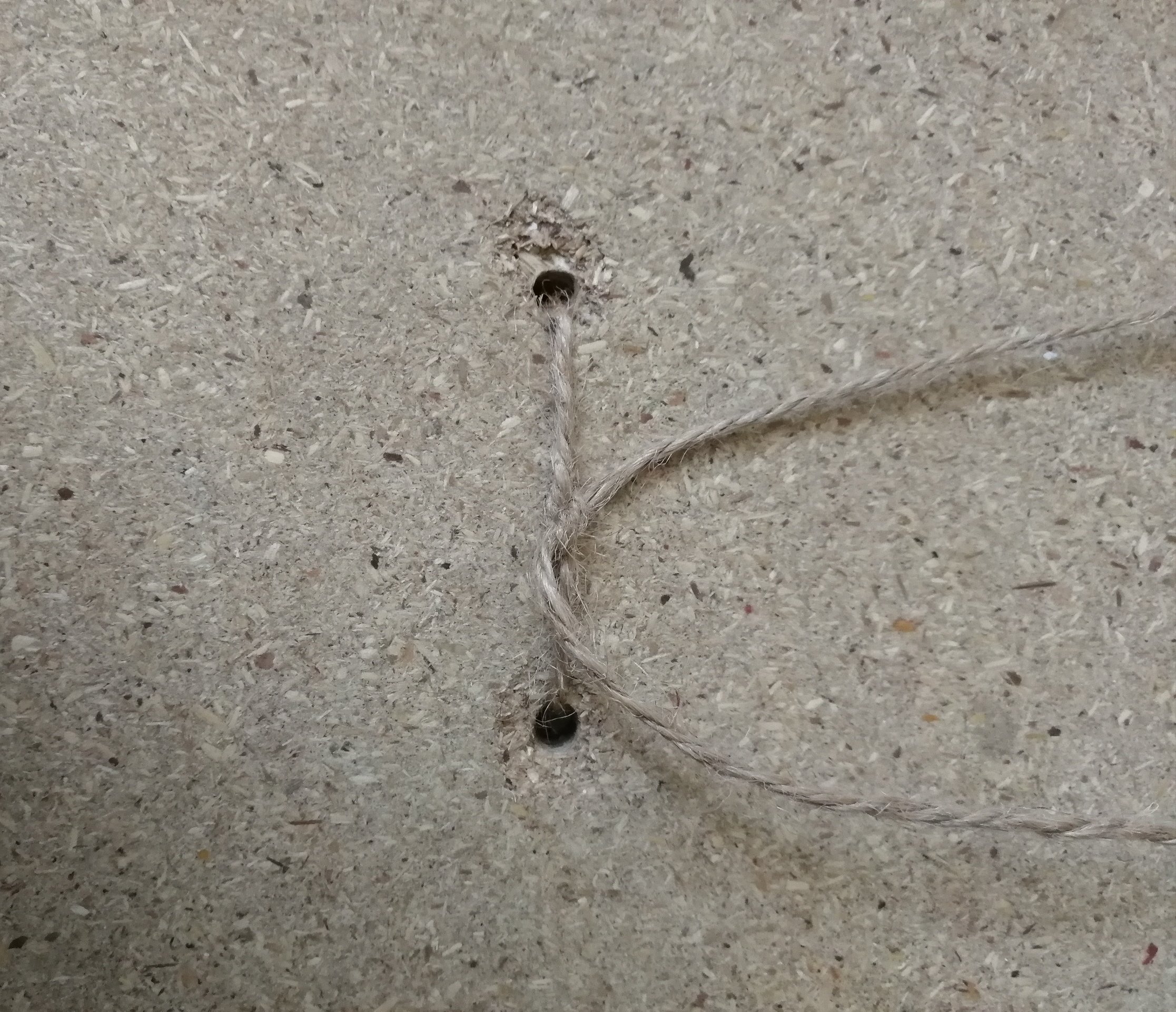 Puis passe les ficelles dans les trous de la planche.