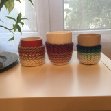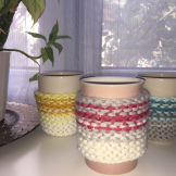 - Installe ton tricot sur le mug et écarte quelques mailles pour pouvoir le fermer avec les boutons.