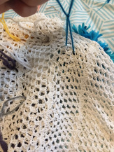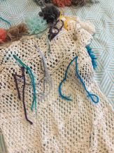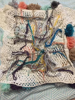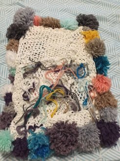 Ne disposant pas de toile à broder et ne souhaitant pas en acheter, j’ai réfléchi à une option intermédiaire, au début je voulais coudre les pompons sur un morceau de tissus, puis en fouillant dans mon sac de vêtement à customiser, car oui j’ai un sac de vêtement que je ne mets plus, mais qui peut servir différemment, enfin bref ! je suis tombée sur ce petit top crocheter qui a rétrécie au lavage et qui était devenu immettable !