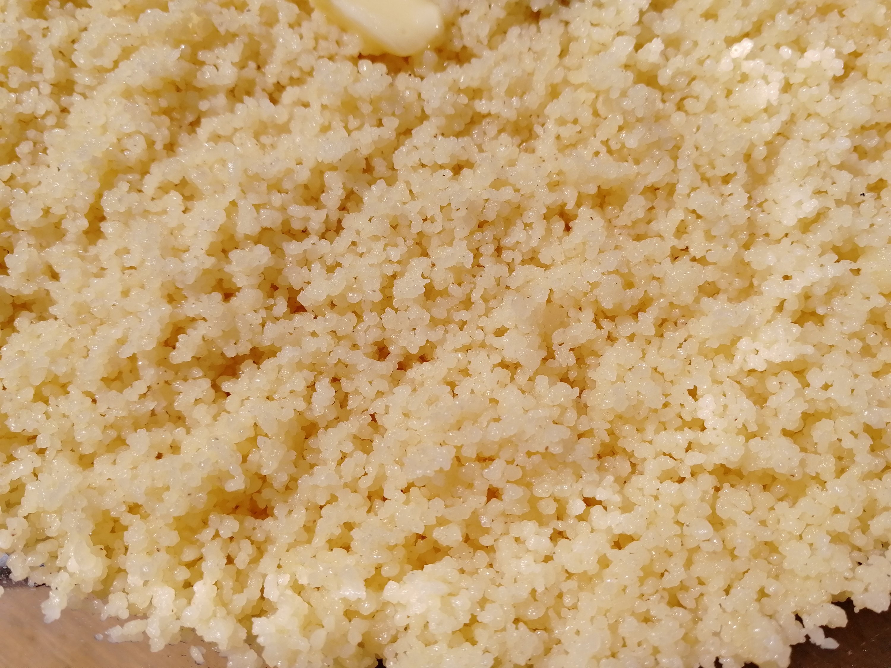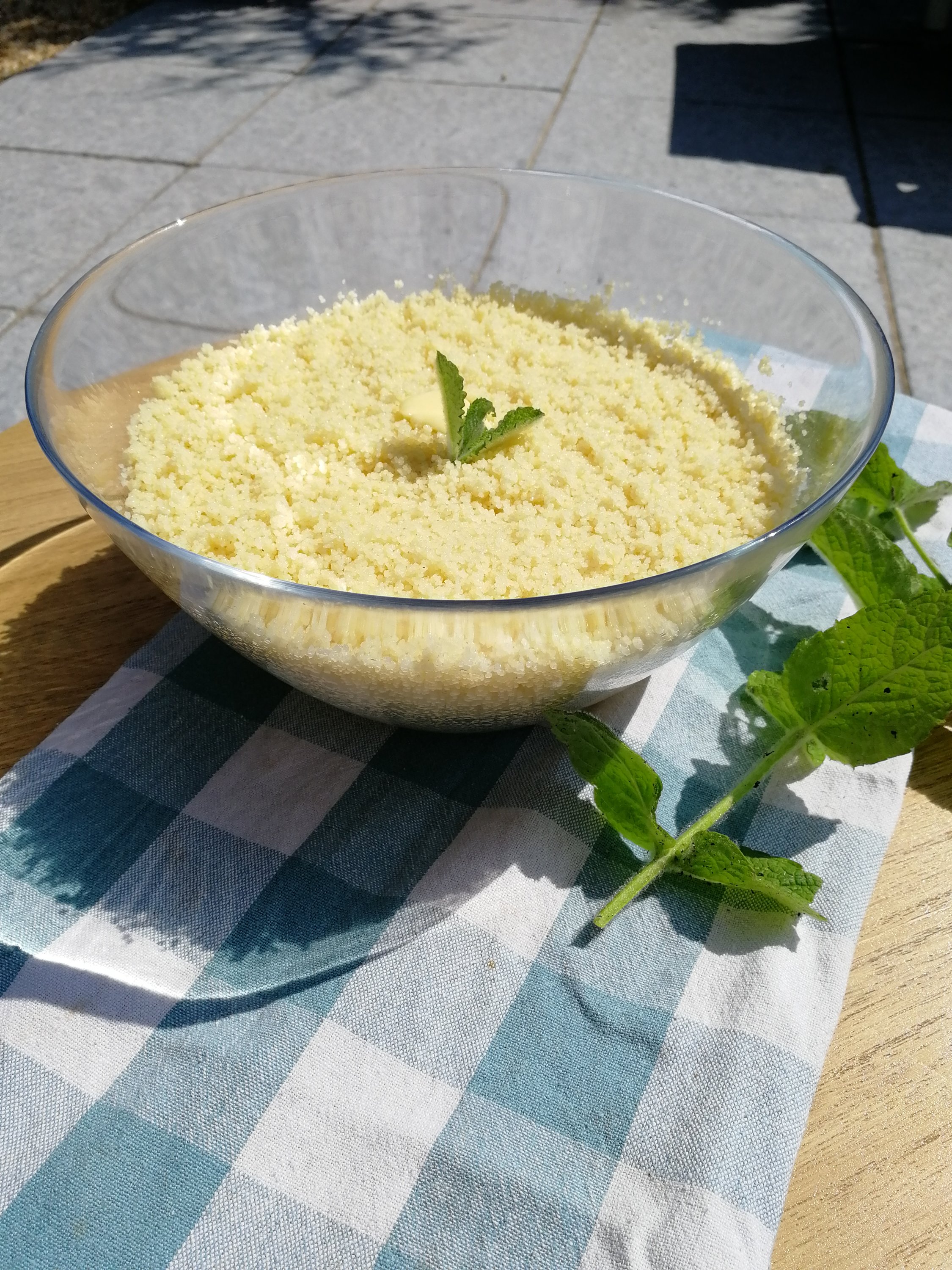 - Mouille ta semoule avec un peu d’eau bouillante et dépose un petit morceau de beurre.