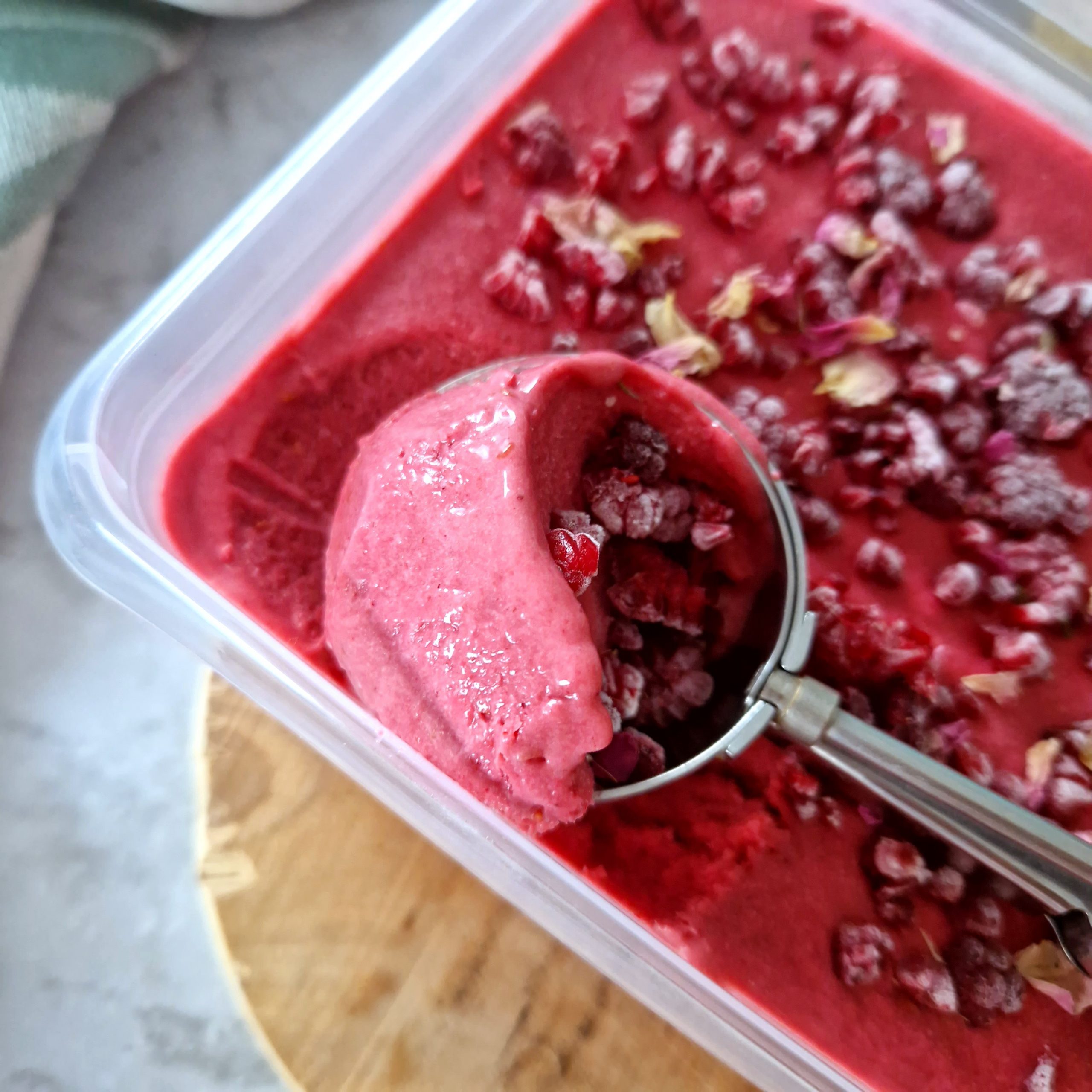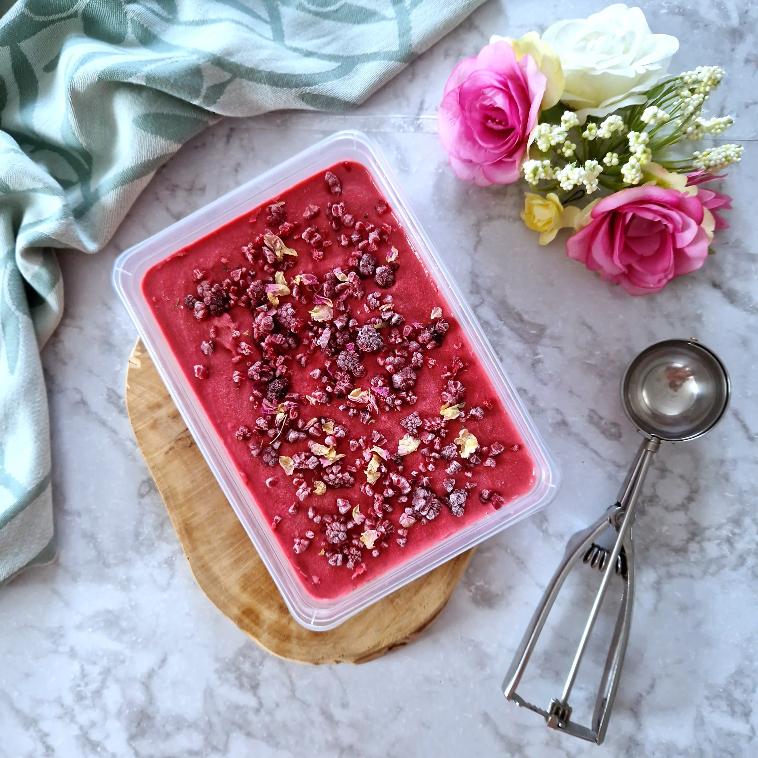 Aujourd’hui je te partage la recette de la glace à la framboise et à la rose sans sorbetière ! C’est une recette facile à préparer, il faut seulement gratter la glace à plusieurs reprises avec une fourchette pour éviter la formation de cristaux de glace.