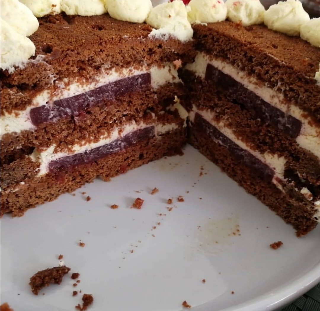 Il s’agit d’un gâteau au yaourt chocolat, avec un insert cerise et une chantilly mascarpone, vraiment simple à réaliser, c’est une pure tuerie à manger ! ;-D
