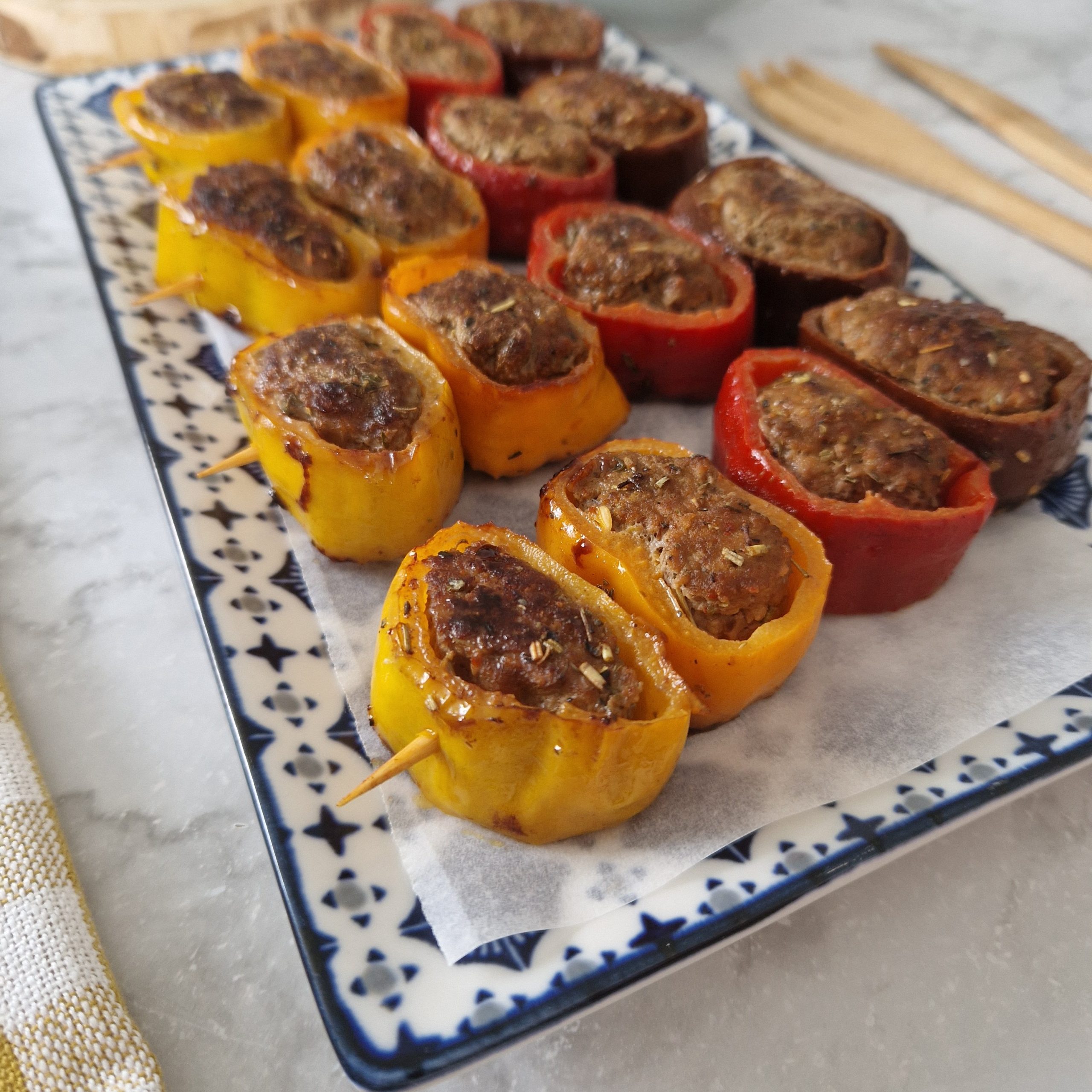- Garnis chaque rondelle de poivron avec la viande hachée, puis glisse-les sur des pics à brochette, en variant les couleurs.