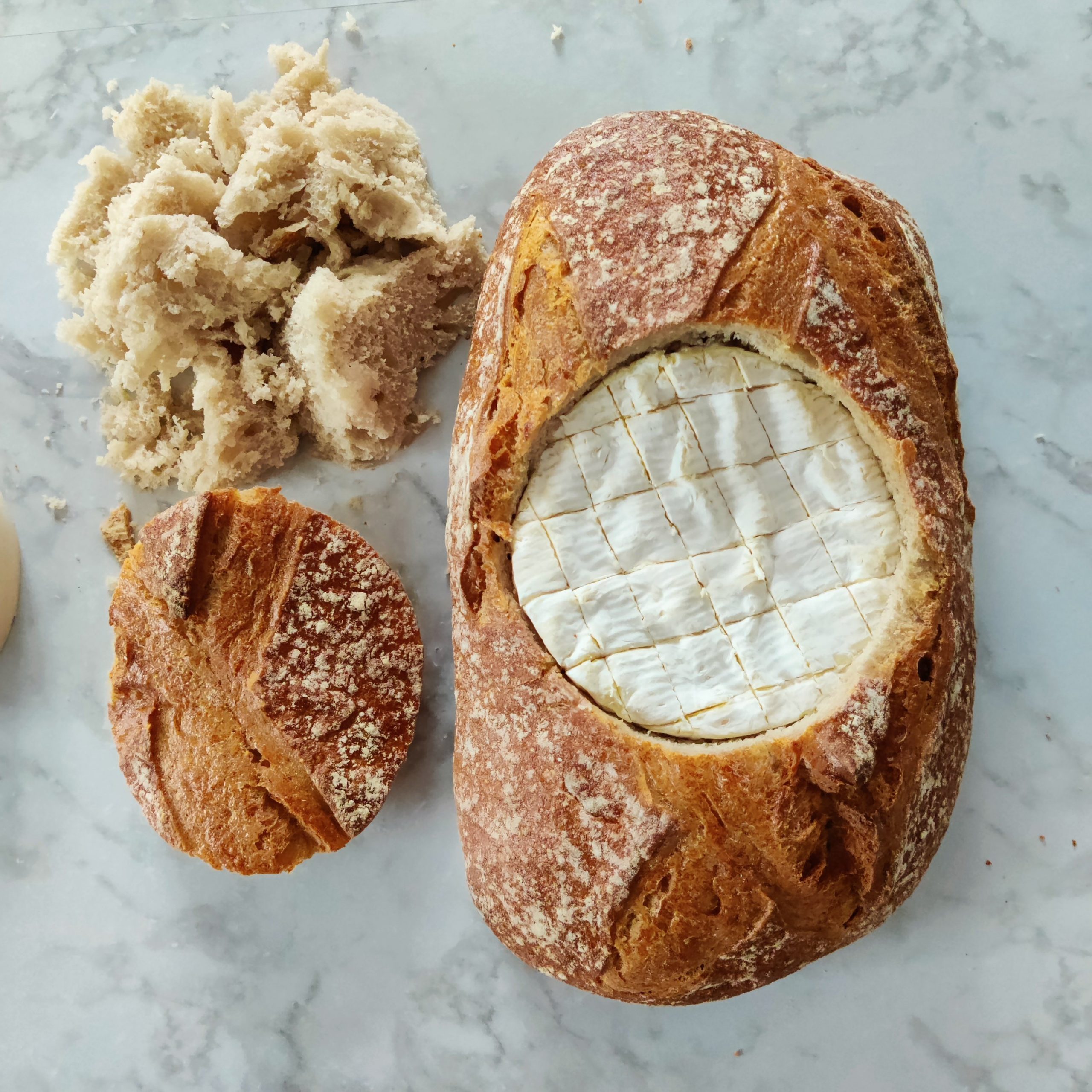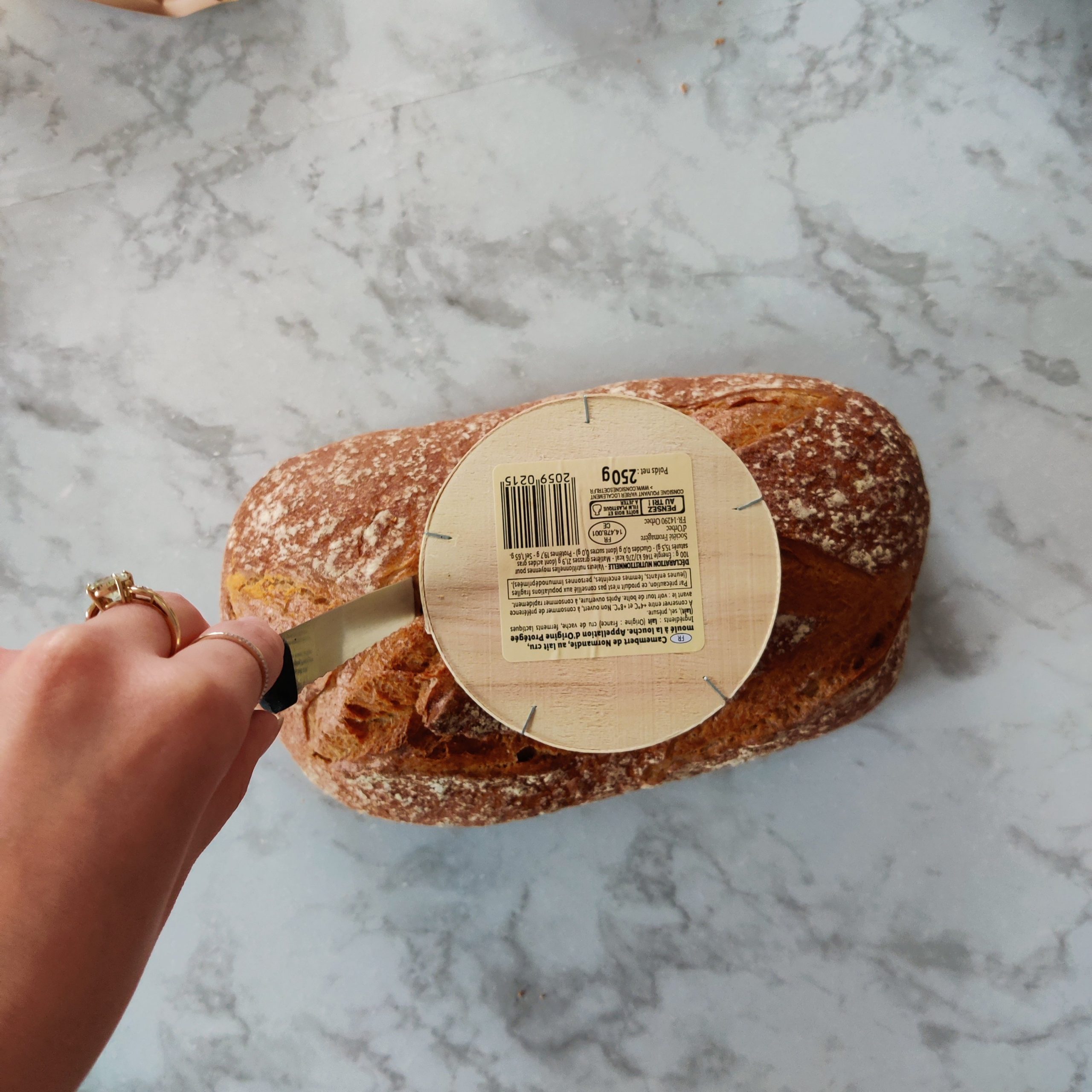- Coupe un rond sur le haut de la boule de pain. (utilise la boîte de camembert comme gabarit)