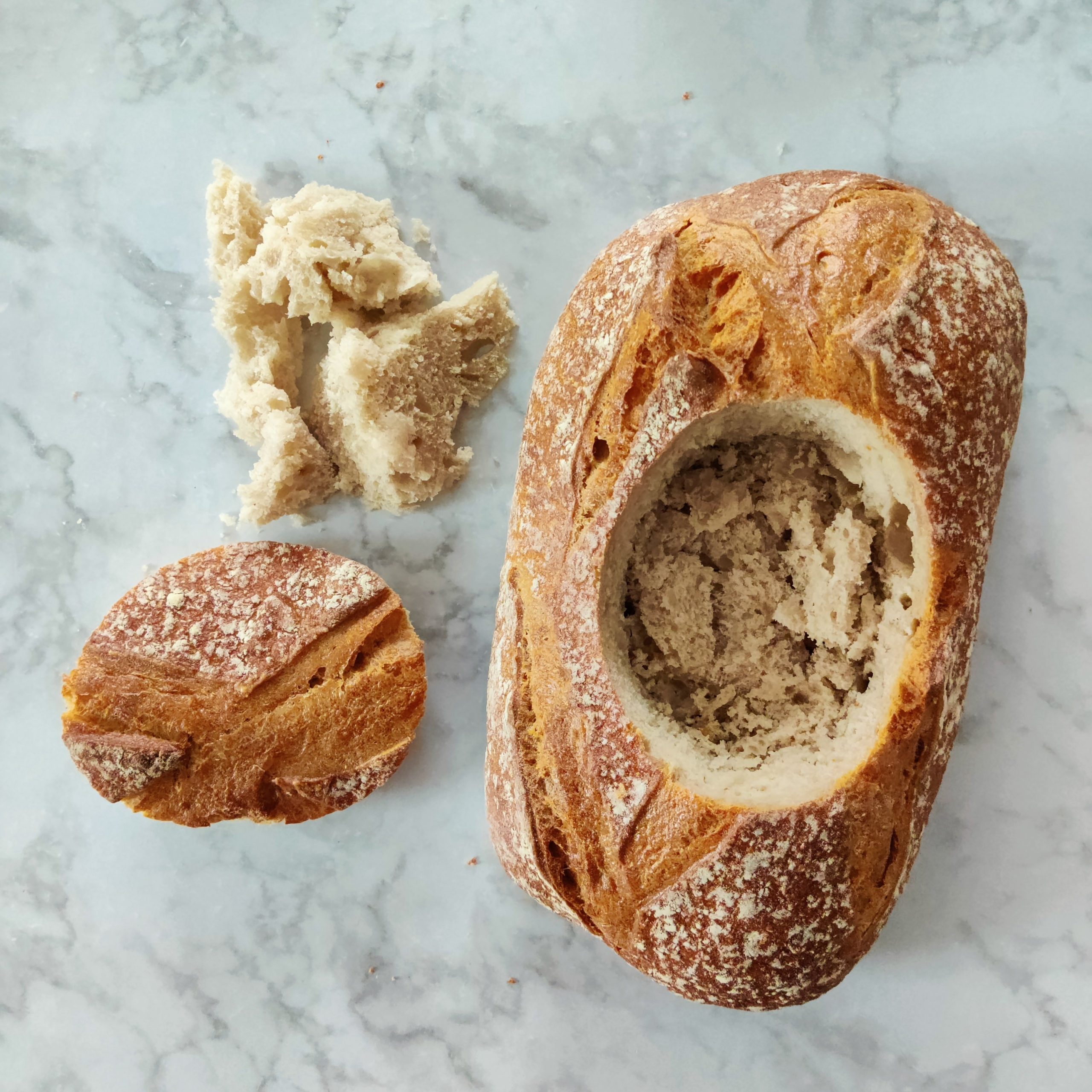 - Retire délicatement le haut de la boule de pain et la mie.