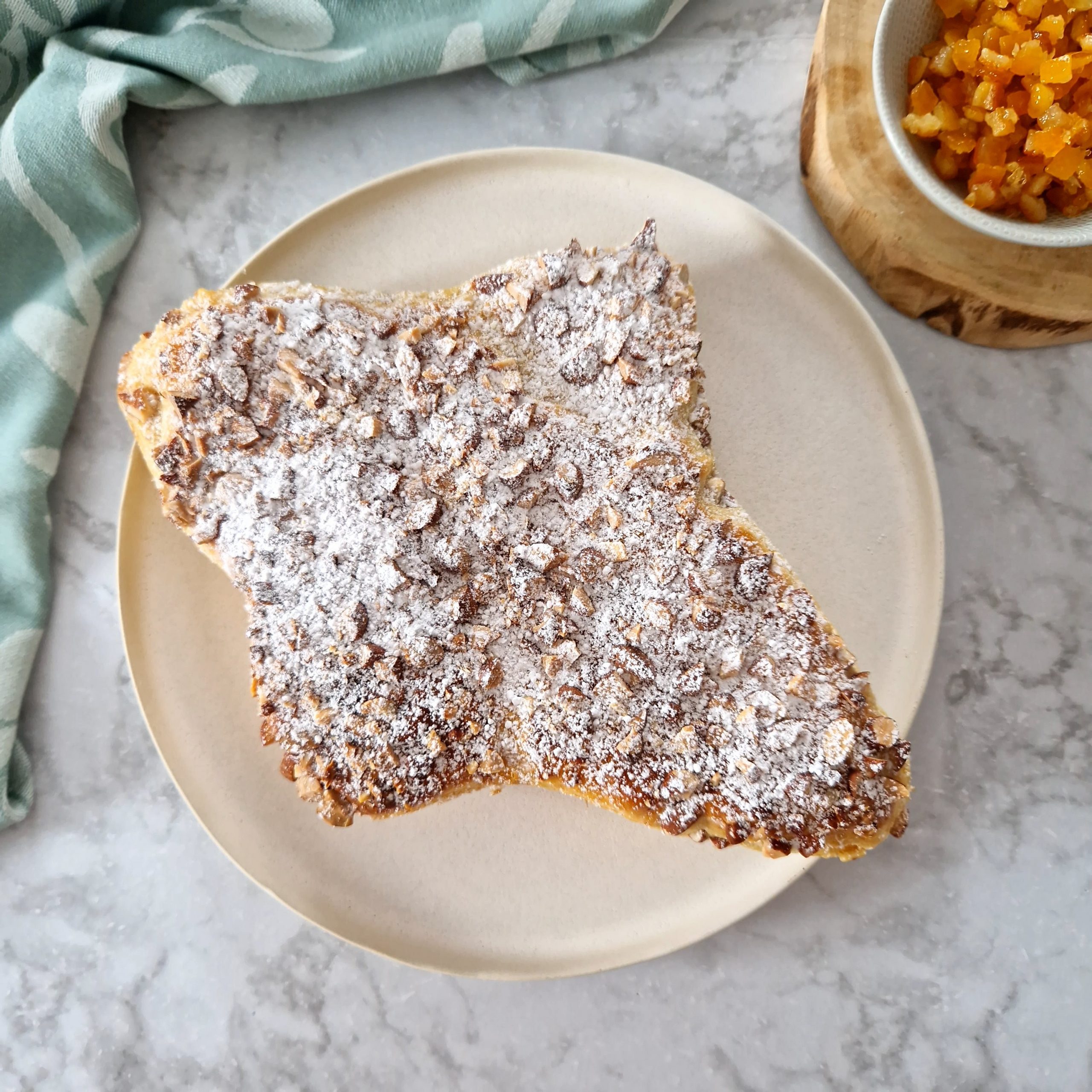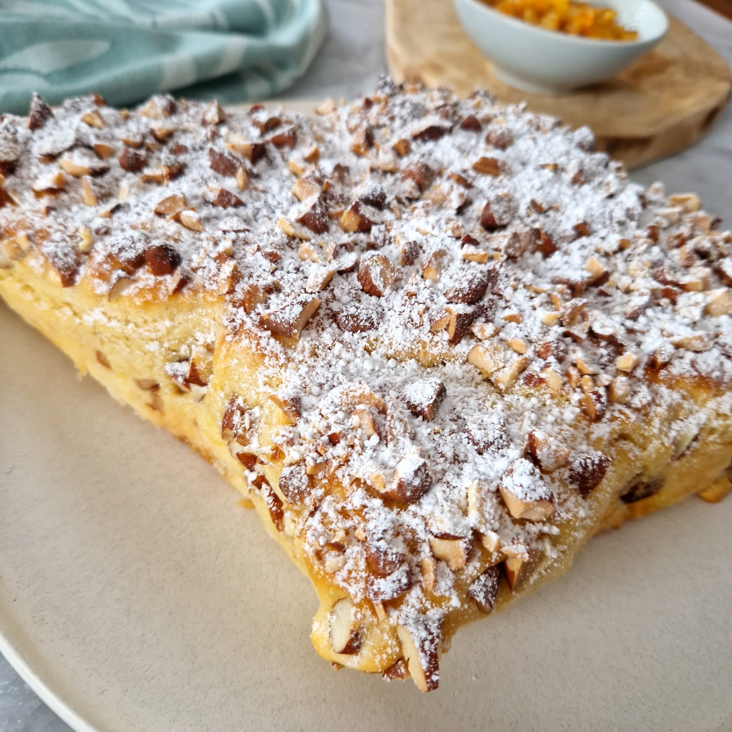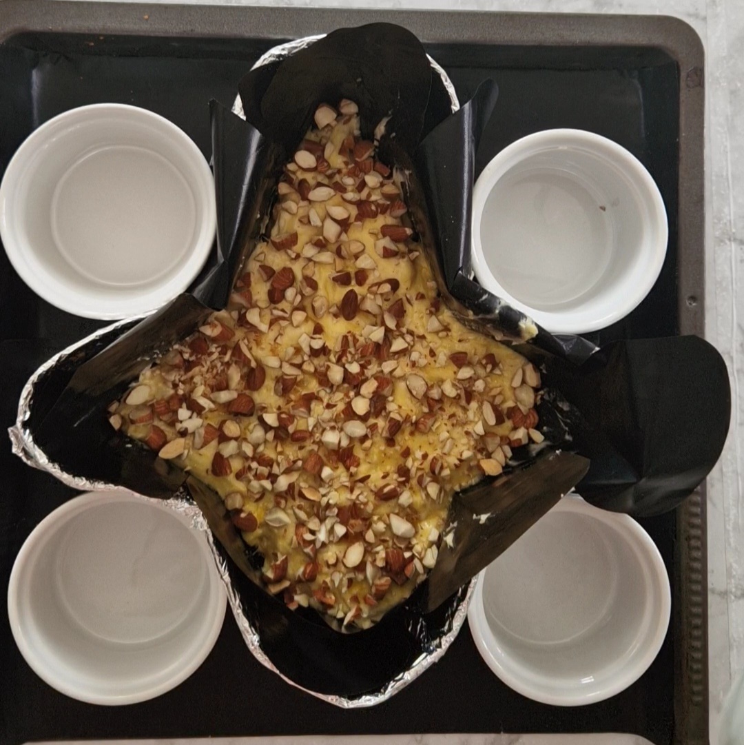 - Saupoudre les amandes concassées, puis laisse lever une dernière fois la pâte, jusqu’à ce qu’elle double de volume.