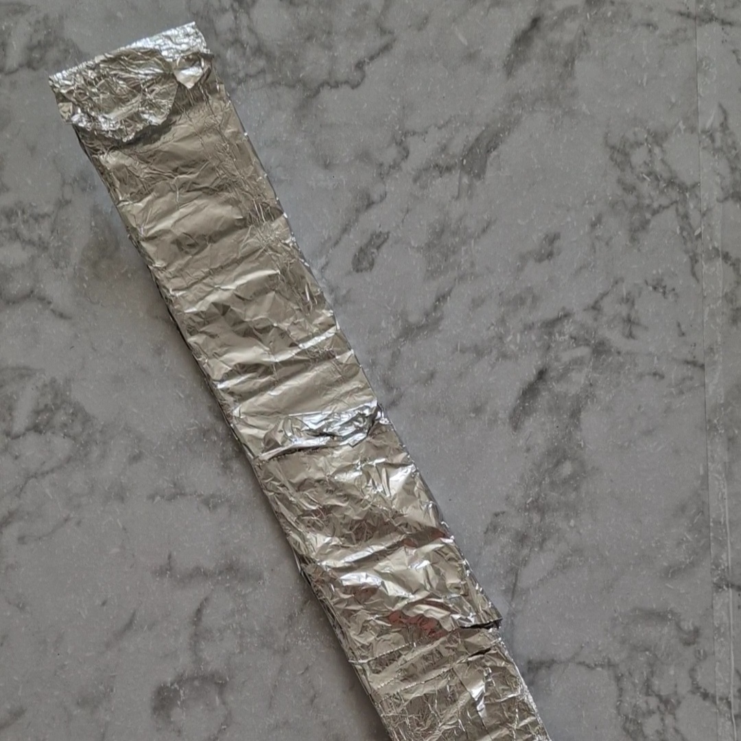 - Puis fixe les bandes entre-elle (une petite – une grande – une petite – une grande) en enroulant des bandes de papier aluminium pour les maintenir.