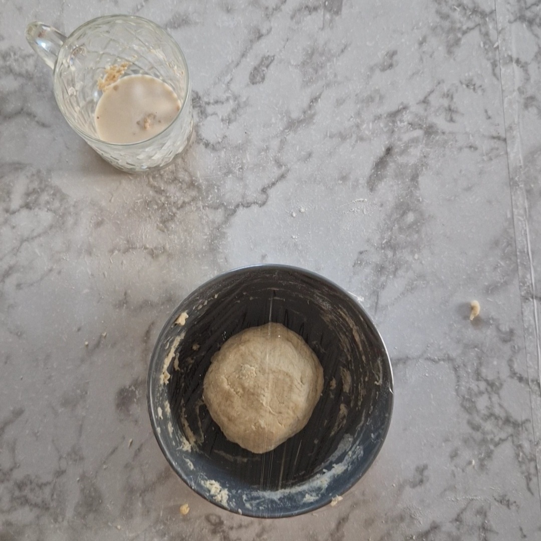 - Mélange 100 g de farine avec un peu du mélange lait / levure (juste de quoi former une boule)