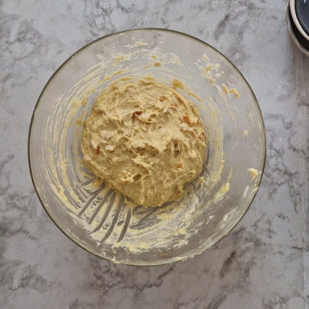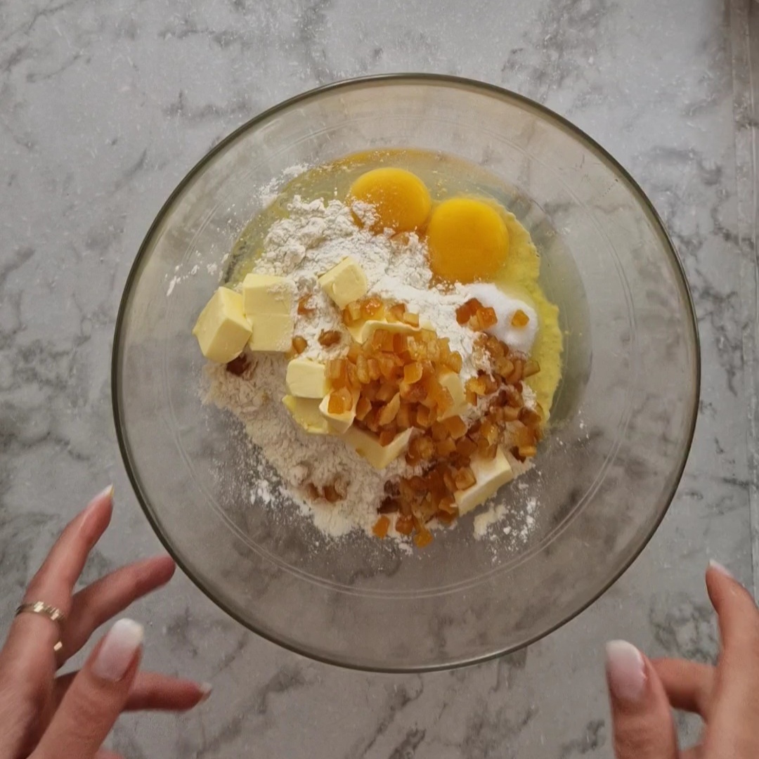 - Ajoute le reste de farine, le reste de lait, les oeufs, le sucre, le beurre, les cubes d’orange confites et une pincée de sel.