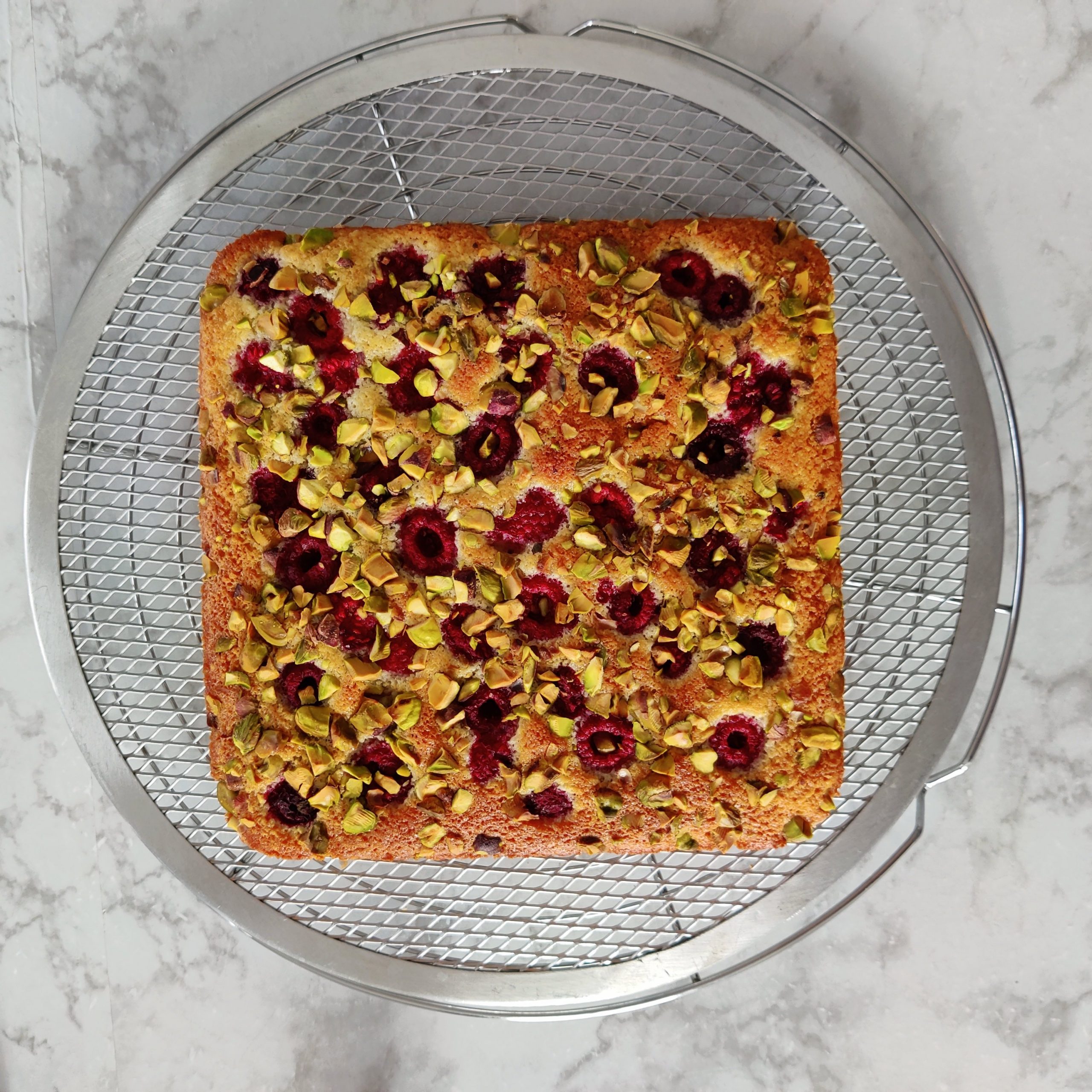 - Ajoute les framboises et les pistaches grossièrement concassées.