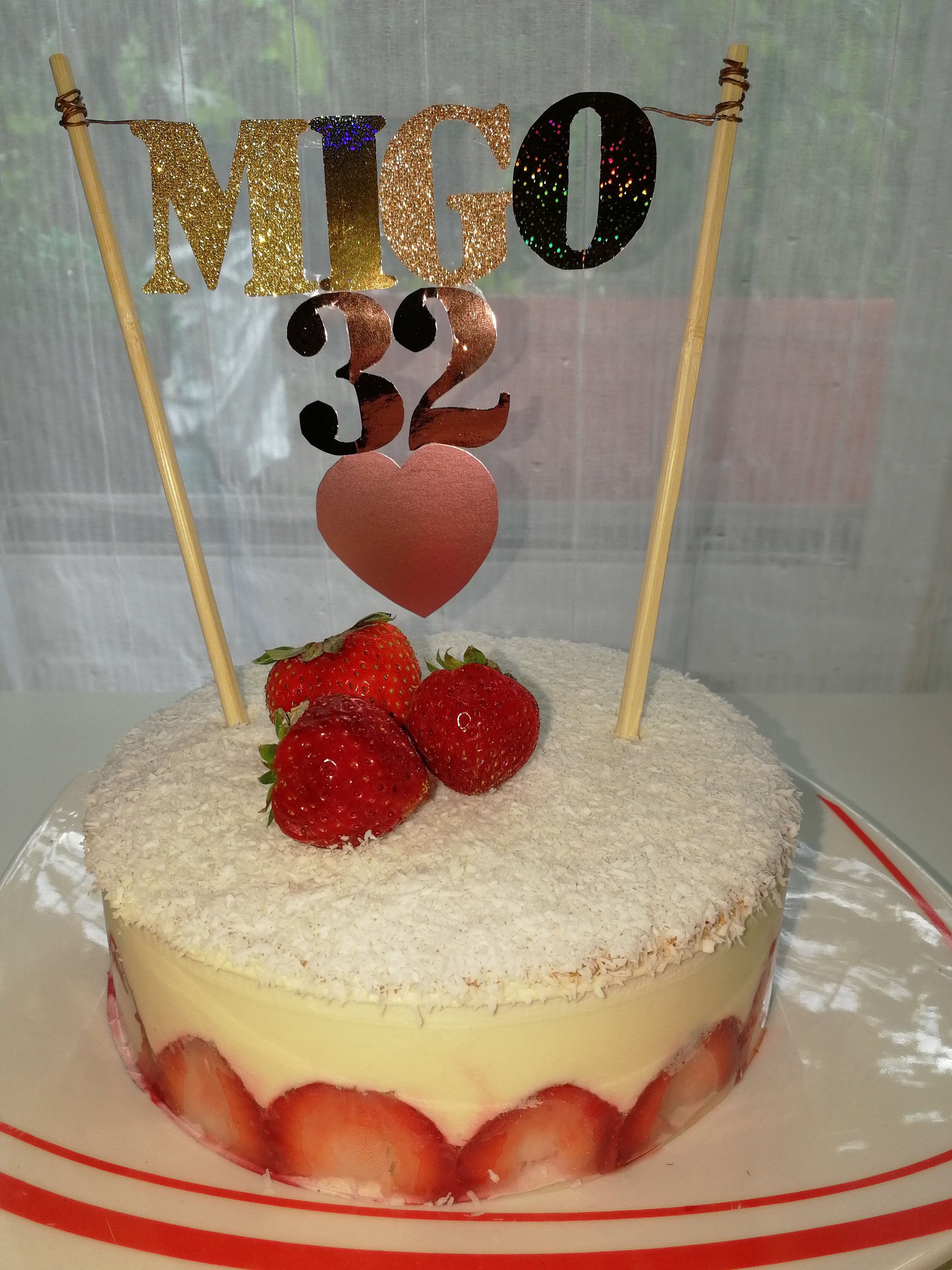 Pour la déco, j’ai seulement saupoudré un peu de coco râpée et disposé quelques fraises, avec en prime une petite banderole faite de mes mimines !