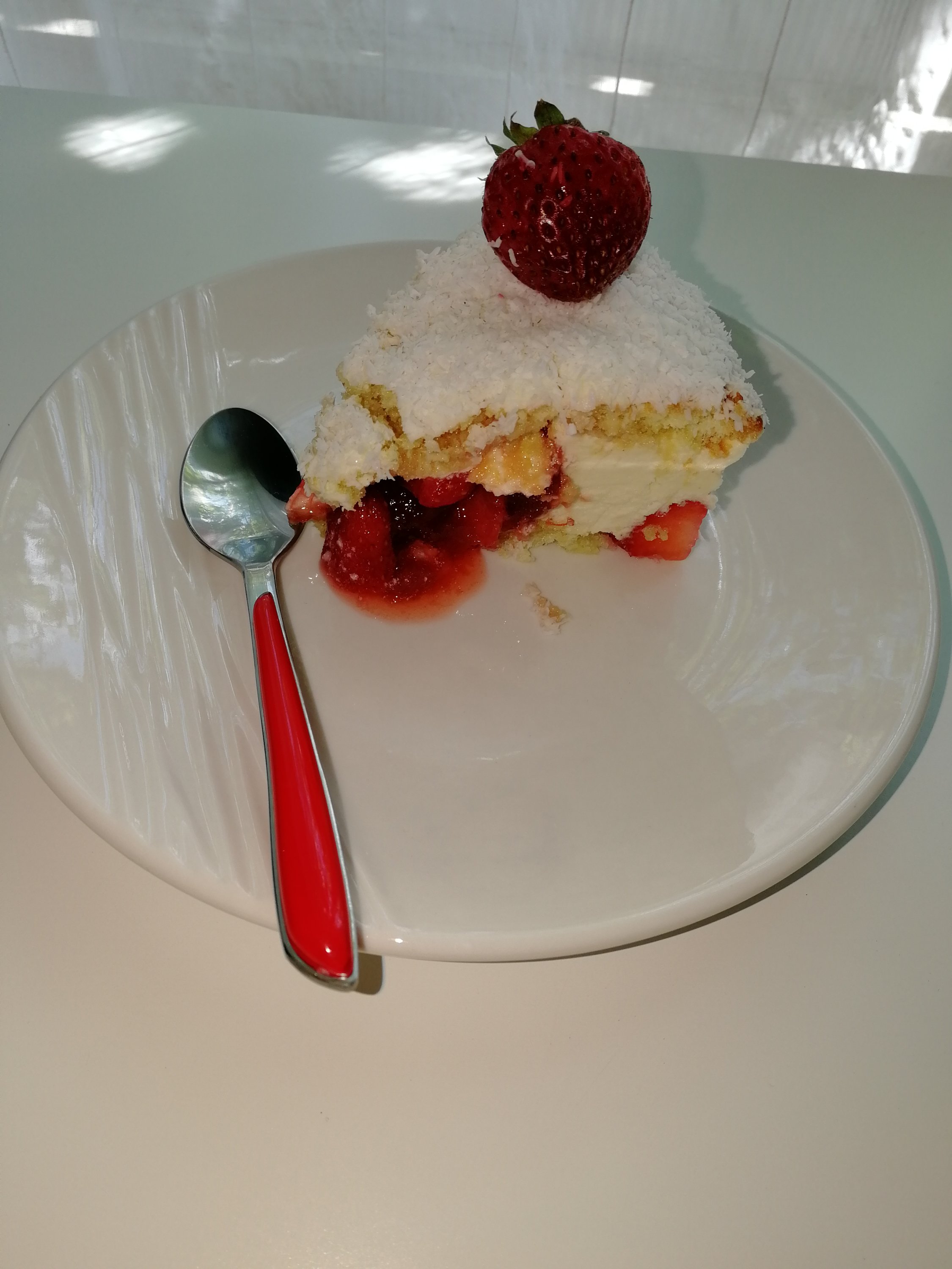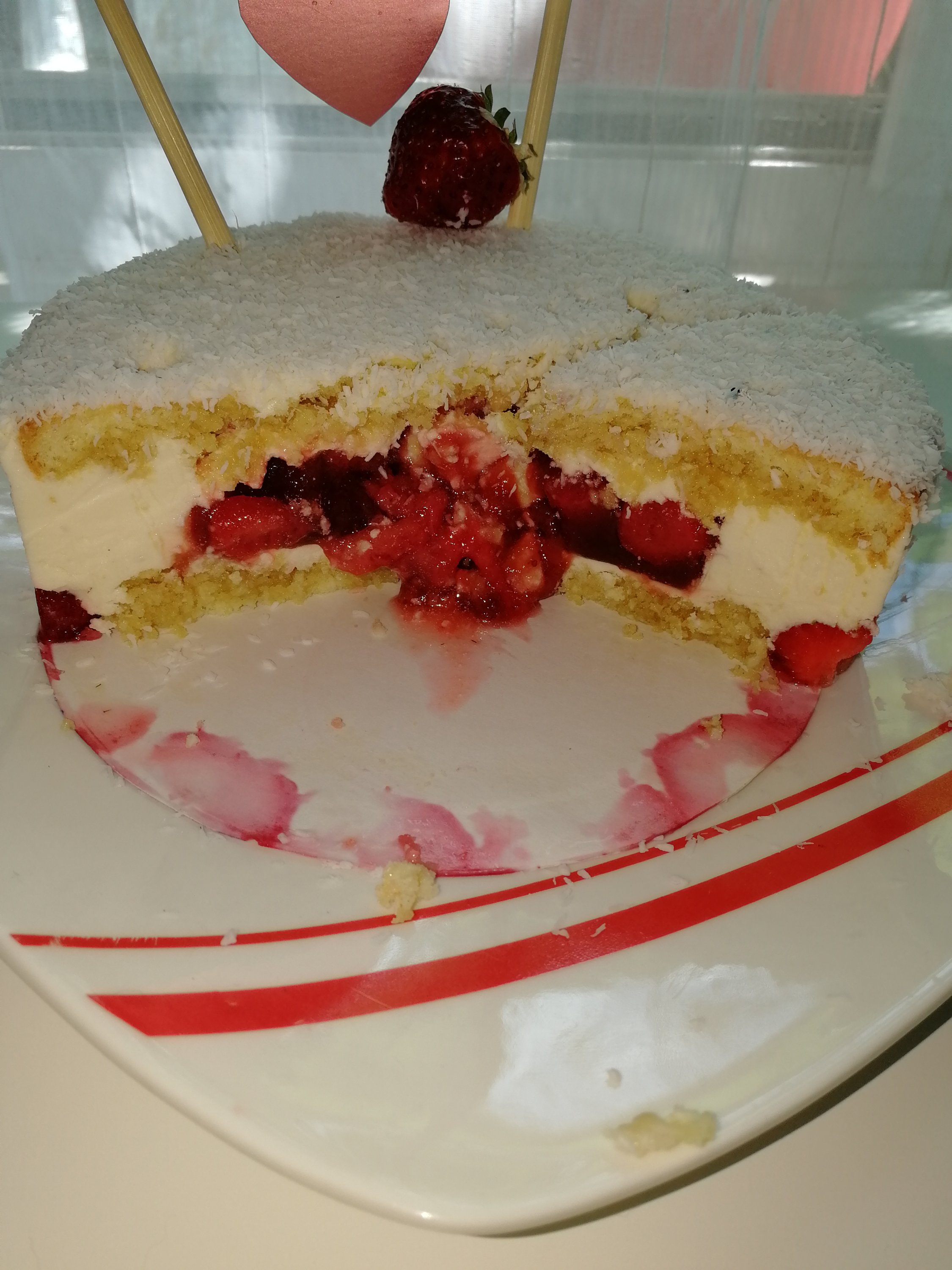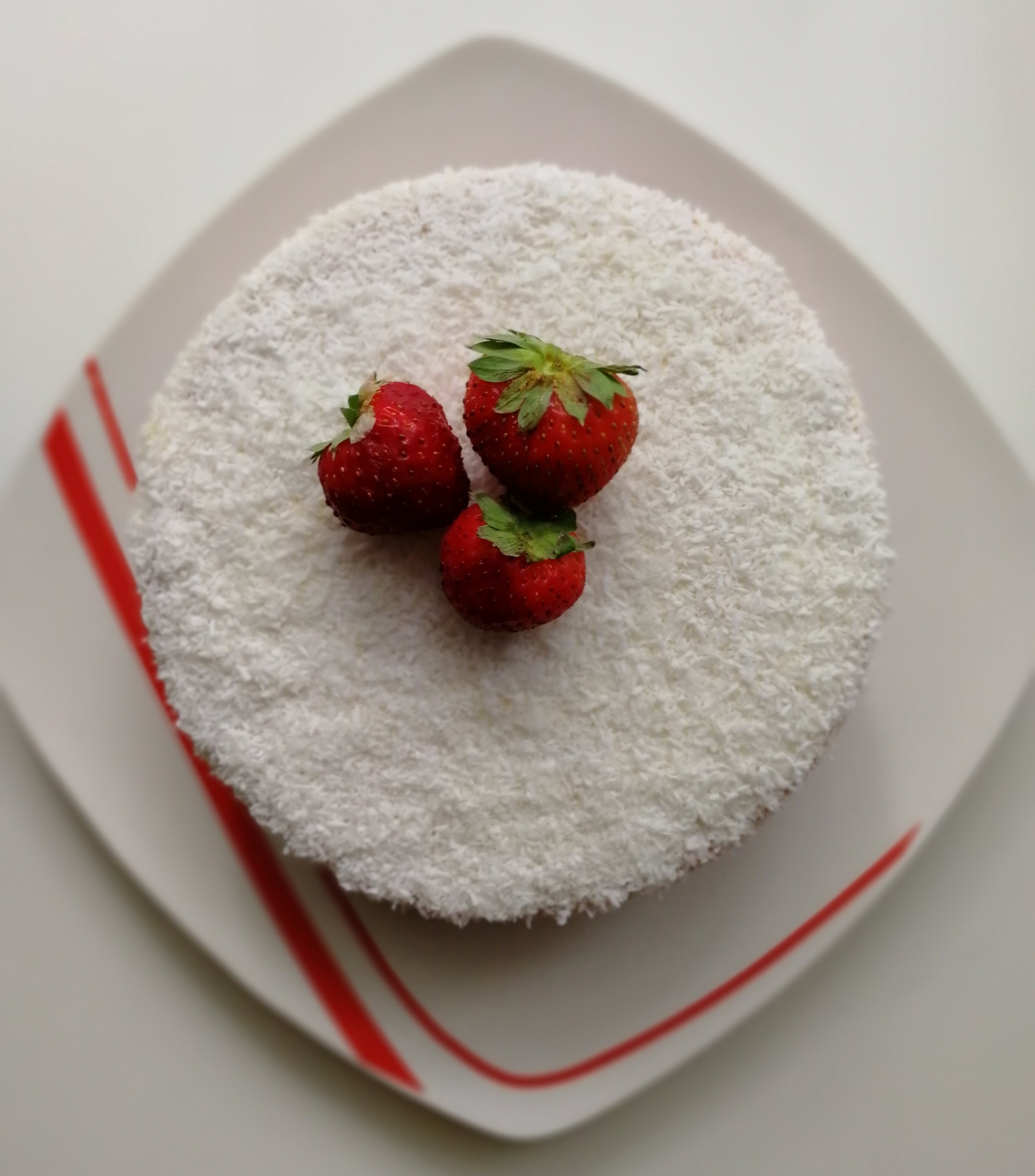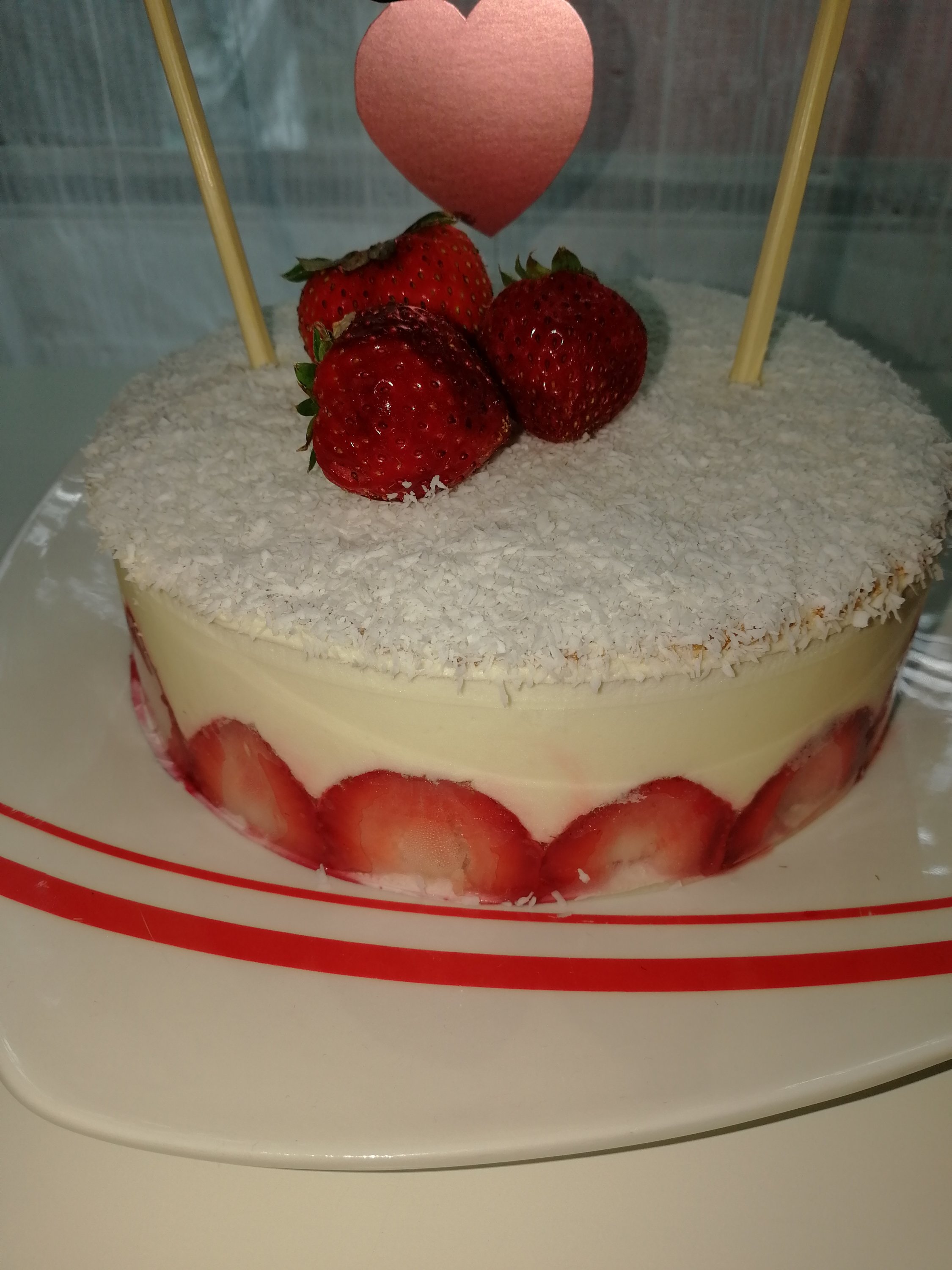 - Saupoudre de la coco râpée et dispose quelques fraises sur le dessus pour terminer le fraisier.