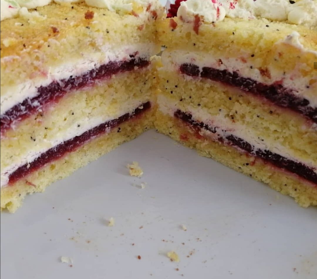 Il s’agit d’un gâteau citron et graine de pavot, avec une fine couche de lemon curd pour le pep’s, un insert cerise et une chantilly mascarpone, c’est un vrai régal !