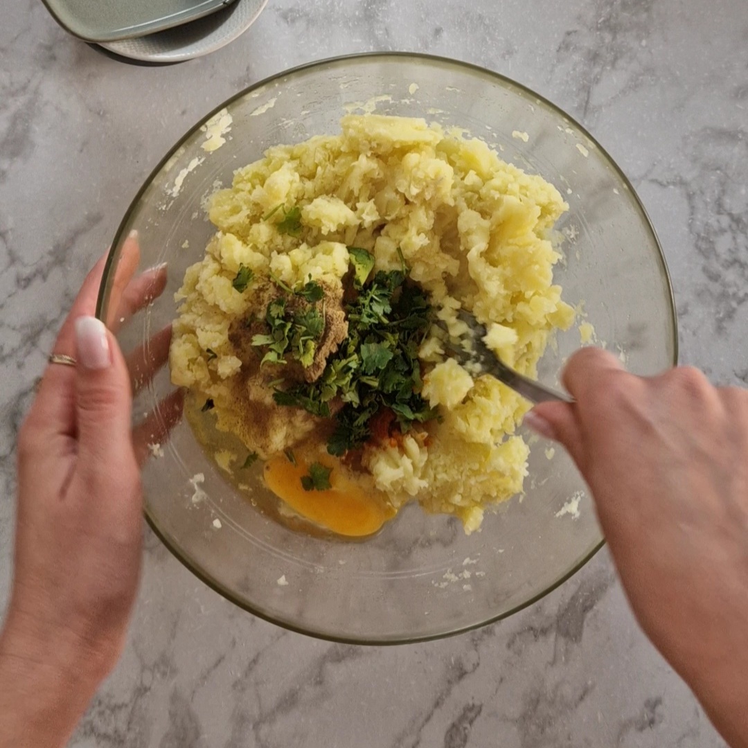 - Ajoute les épices, du sel, l’oeuf et la coriandre, puis mélange.