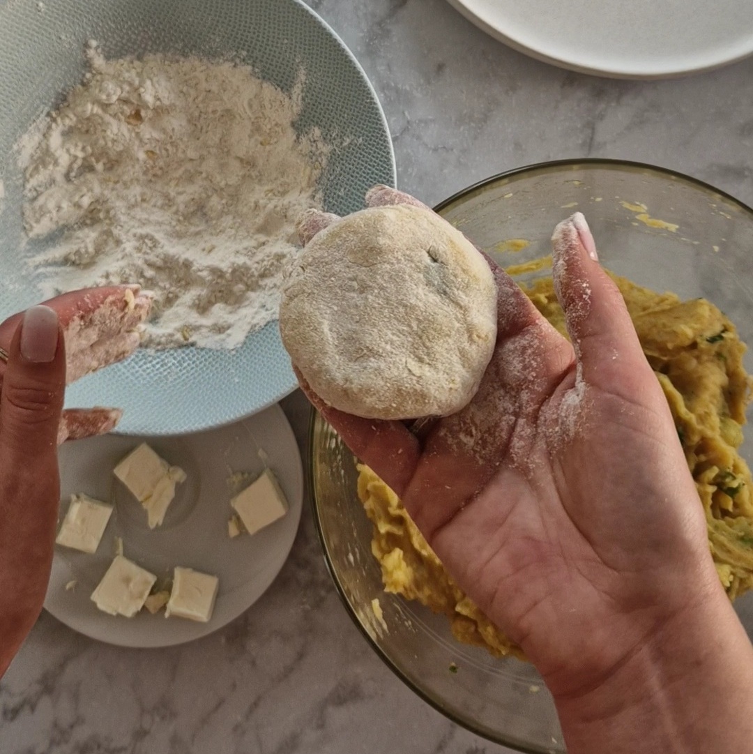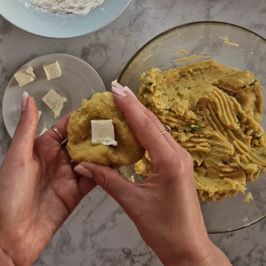- Forme des boulettes, puis ajoute un morceau de fromage au centre, referme-les, puis enroule-les dans la farine.