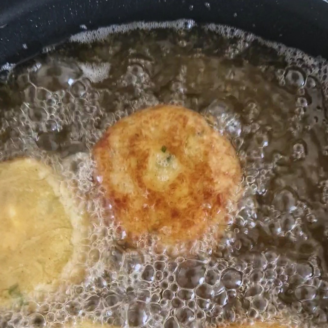 - Chauffe un bain d’huile sur feu vif, puis plonge les galettes dans l’huile chaude.
