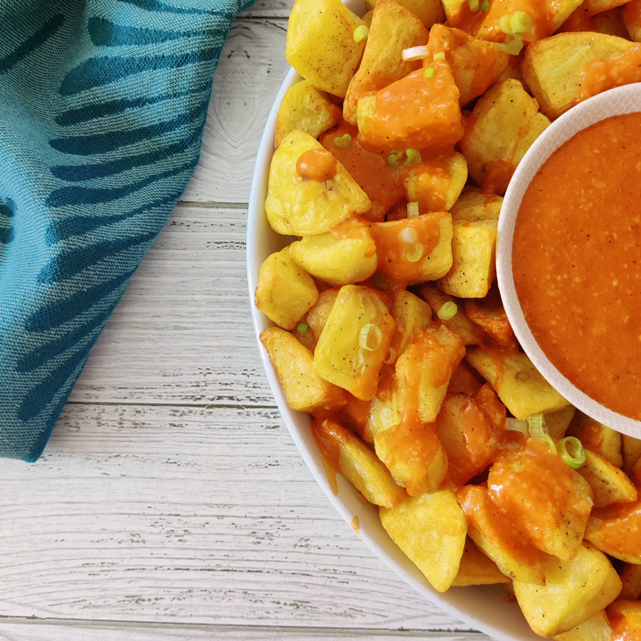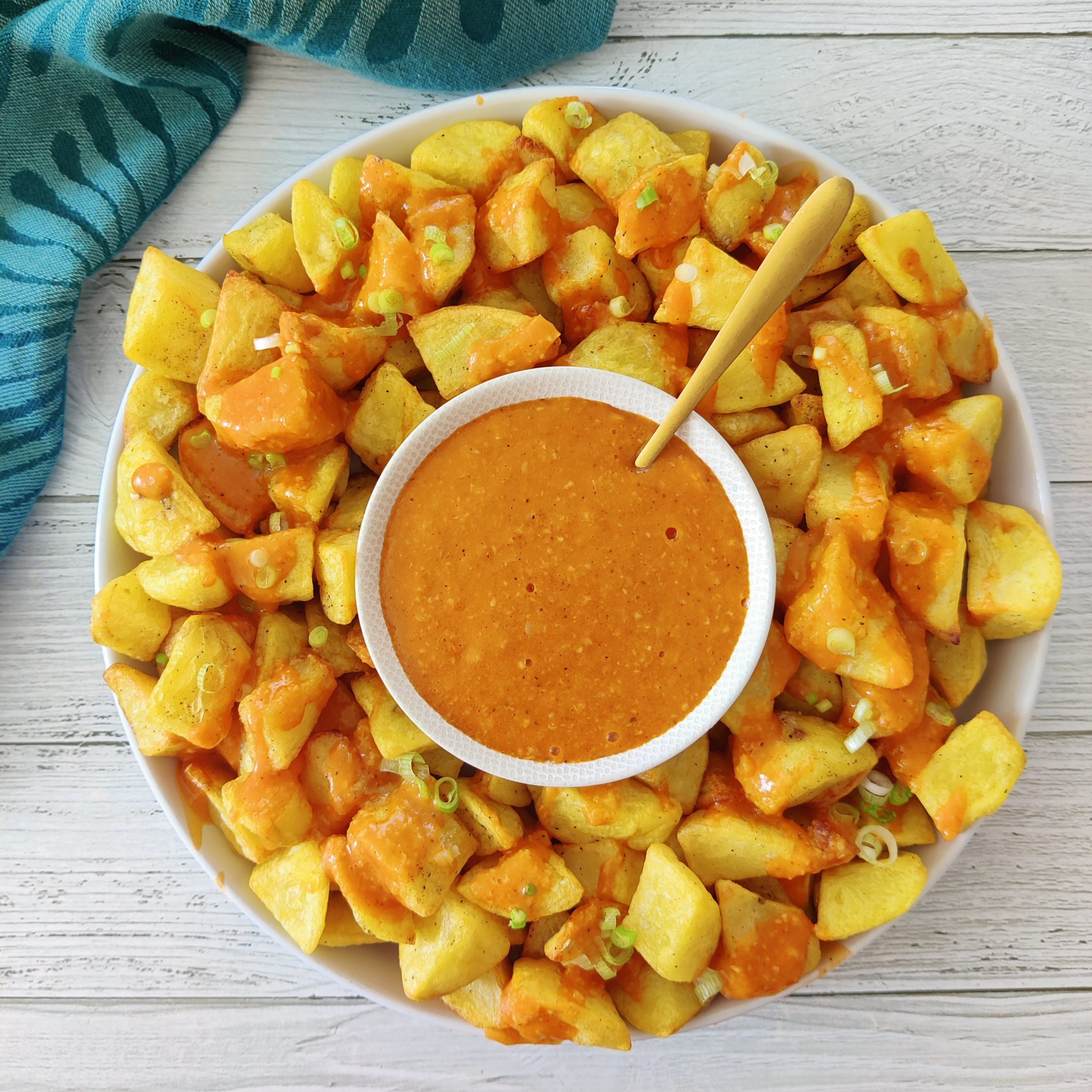 Aujourd’hui je te partage ma recette de patatas bravas, il s’agit de frites cubes accompagnée d’une sauce epicée. C’est une recette de tapas tout droit venu d’Espagne et c’est un vrai régal !