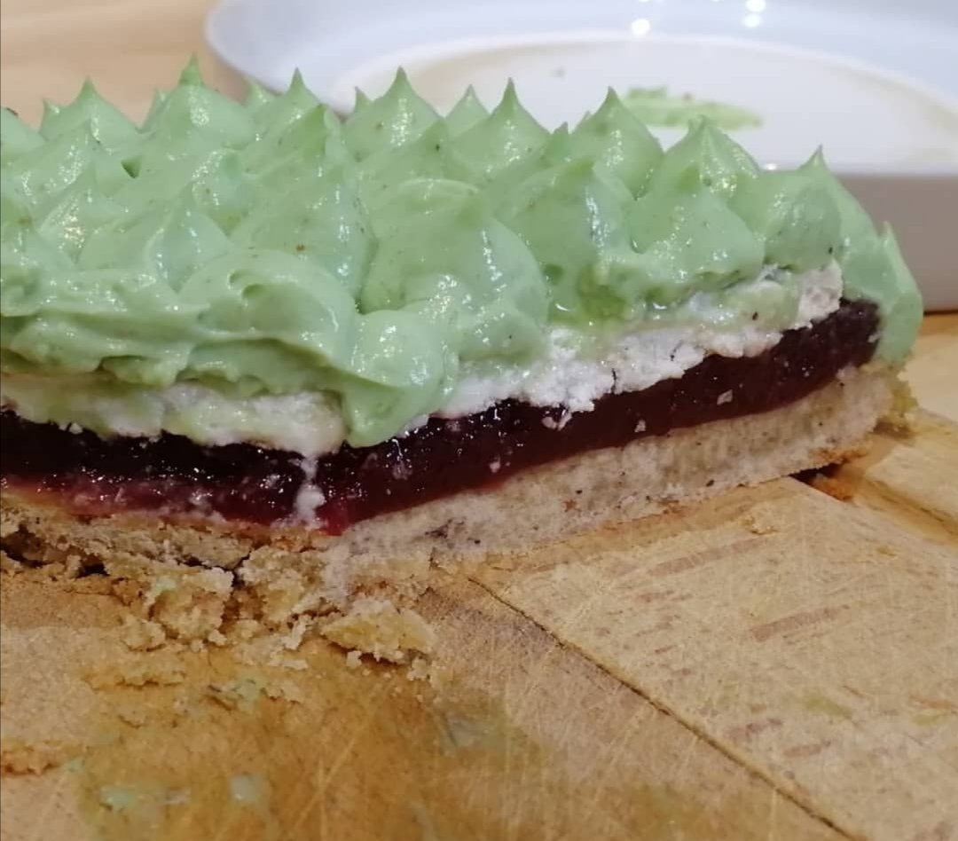 Elle se compose d’une base de pâte sablée aux noisettes, un insert cerise, un disque de meringue et d’une onctueuse crème diplomate à la pistache ;-D