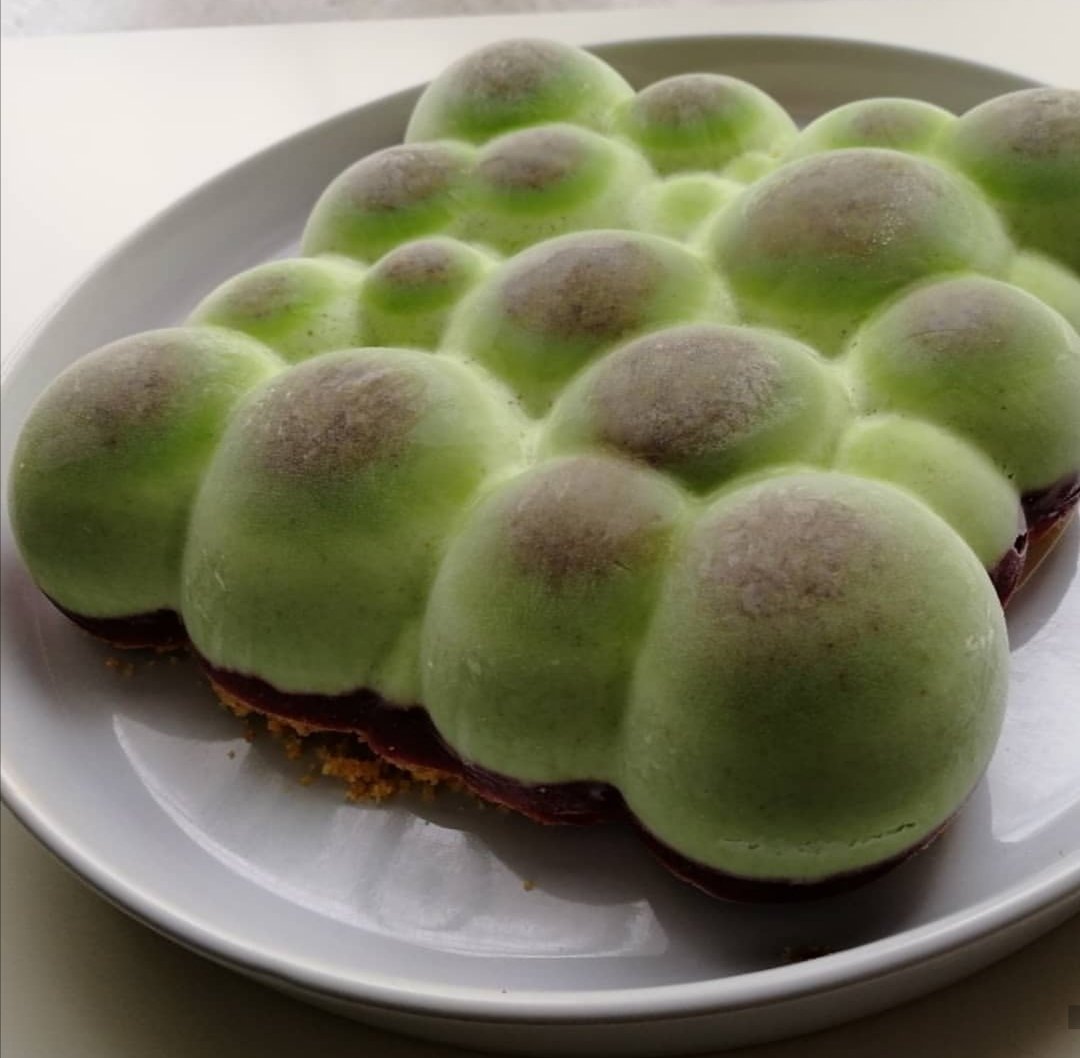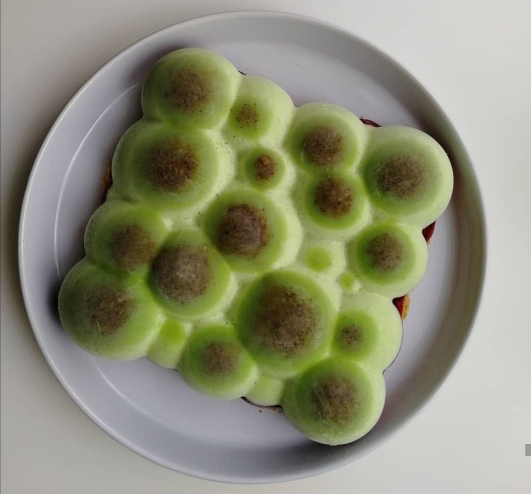 - Verse ta préparation chaude directement sur la mousse pistache.