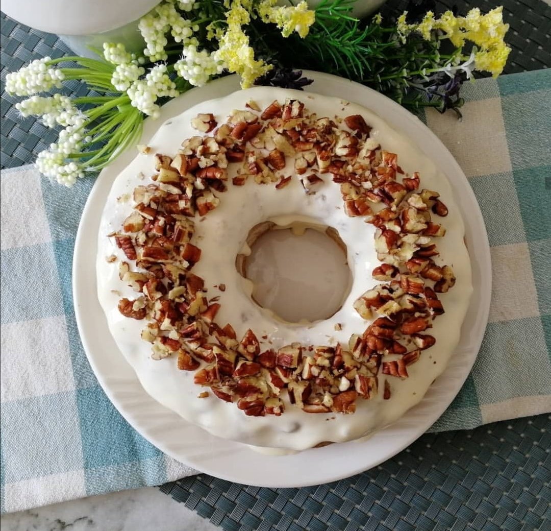 Il ne te reste plus qu’à en déposé sur le dessus du gâteau, puis à saupoudrer un peu de noix de pécan en morceaux pour la déco.